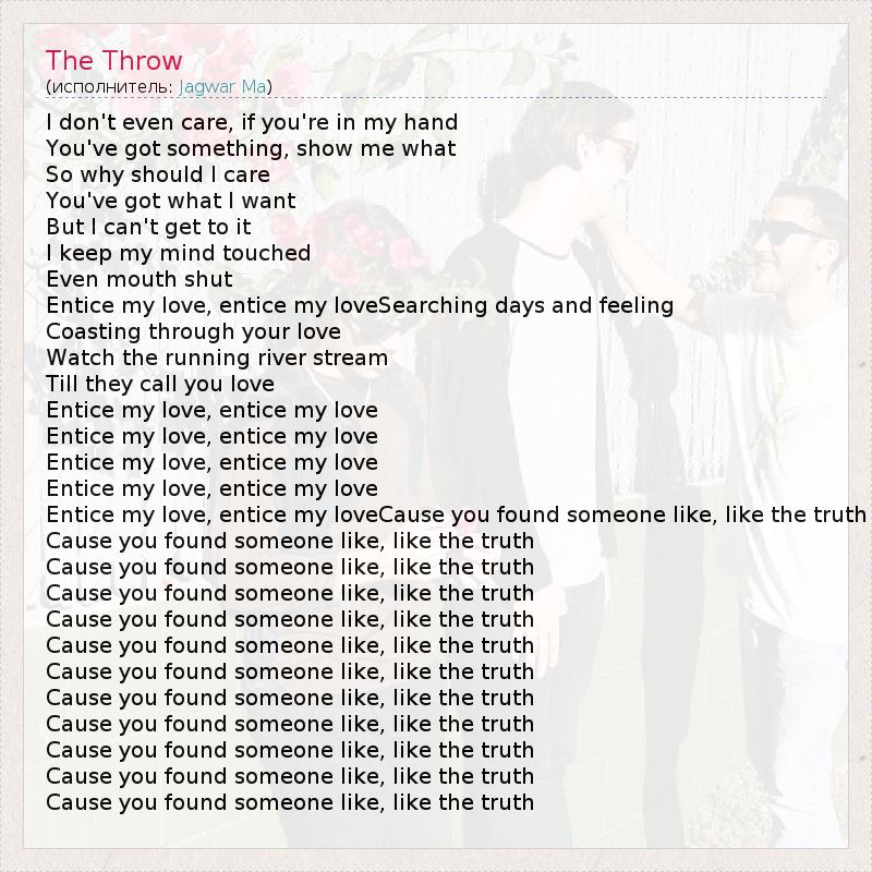 I don't even care, if you're in my hand You've got something, show me what So why should I care You've got what I want But I can't get to it I keep my mind touched Even mouth shut Entice my love, entice my loveSearching days and feeling Coasting through your love Watch the running river stream Till they call you love Entice my love, entice my love Entice my love, entice my love Entice my love, entice my love Entice my love, entice my love Entice my love, entice my loveCause you found someone like, like the truth Cause you found someone like, like the truth Cause you found someone like, like the truth Cause you found someone like, like the truth Cause you found someone like, like the truth Cause you found someone like, like the truth Cause you found someone like, like the truth Cause you found someone like, like the truth Cause you found someone like, like the truth Cause you found someone like, like the truth Cause you found someone like, like the truth Cause you found someone like, like the truth