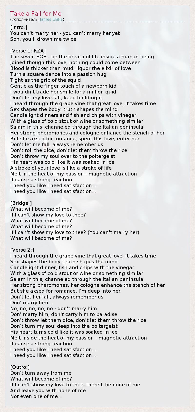 [Intro:] You can't marry her - you can't marry her yet Son, you'll drown me twice [Verse 1: RZA] The seven EOE - be the breath of life inside a human being Joined though this love, nothing could come between Blood is thicker than mud, liquor the elixir of love Turn a square dance into a passion hug Tight as the grip of the squid Gentle as the finger touch of a newborn kid I wouldn't trade her smile for a million quid Don't let my love fall, keep building it I heard through the grape vine that great love, it takes time Sex shapes the body, truth shapes the mind Candlelight dinners and fish and chips with vinegar With a glass of cold stout or wine or something similar Salam in this, channeled through the Italian peninsula Her strong pheromones and cologne enhance the stench of her But she aksed for romance, spent this love, enter her Don't let me fall, always remember us Don't roll the dice, don't let them throw the rice Don't throw my soul over to the poltergeist His heart was cold like it was soaked in ice A stroke of your love is like a stroke of life Melt in the heat of my passion - magnetic attraction It cause a strong reaction I need you like I need satisfaction... I need you like I need satisfaction... [Bridge:] What will become of me? If I can't show my love to thee? What will become of me? What will become of me? If I can't show my love to thee? (You can't marry her) What will become of me? [Verse 2:] I heard through the grape vine that great love, it takes time Sex shapes the body, truth shapes the mind Candlelight dinner, fish and chips with the vinegar With a glass of cold stout or wine or something similar Salam in this, channeled through the Italian peninsula Her strong pheromones, her cologne enhance the stench of her But she aksed for romance, I'm deep into her Don't let her fall, always remember us Don' marry him... No, no, no, no, no - don't marry him Don' marry him, don't carry him to paradise Don't throw let them dice, don't let them throw the rice Don't turn my soul deep into the poltergeist His heart turns cold like it was soaked in ice Melt inside the heat of my passion - magnetic attraction It cause a strong reaction I need you like I need satisfaction... I need you like I need satisfaction... [Outro:] Don't turn away from me What will become of me? If I can't show my love to thee, there'll be none of me And leave you with none of me Not even one of me...