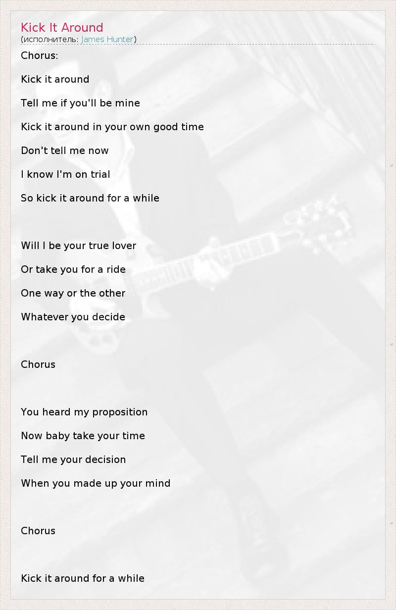 Chorus: Kick it around Tell me if you'll be mine Kick it around in your own good time Don't tell me now I know I'm on trial So kick it around for a while Will I be your true lover Or take you for a ride One way or the other Whatever you decide Chorus You heard my proposition Now baby take your time Tell me your decision When you made up your mind Chorus Kick it around for a while