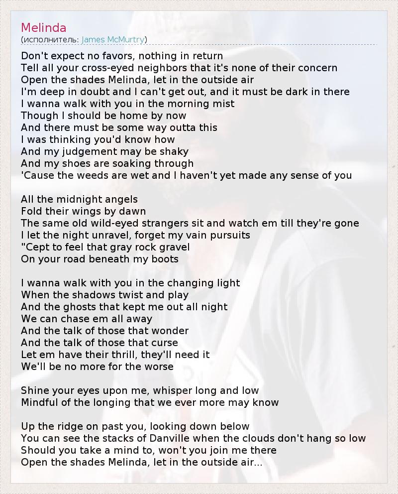 Don't expect no favors, nothing in return Tell all your cross-eyed neighbors that it's none of their concern Open the shades Melinda, let in the outside air I'm deep in doubt and I can't get out, and it must be dark in there I wanna walk with you in the morning mist Though I should be home by now And there must be some way outta this I was thinking you'd know how And my judgement may be shaky And my shoes are soaking through 'Cause the weeds are wet and I haven't yet made any sense of you All the midnight angels Fold their wings by dawn The same old wild-eyed strangers sit and watch em till they're gone I let the night unravel, forget my vain pursuits "Cept to feel that gray rock gravel On your road beneath my boots I wanna walk with you in the changing light When the shadows twist and play And the ghosts that kept me out all night We can chase em all away And the talk of those that wonder And the talk of those that curse Let em have their thrill, they'll need it We'll be no more for the worse Shine your eyes upon me, whisper long and low Mindful of the longing that we ever more may know Up the ridge on past you, looking down below You can see the stacks of Danville when the clouds don't hang so low Should you take a mind to, won't you join me there Open the shades Melinda, let in the outside air...