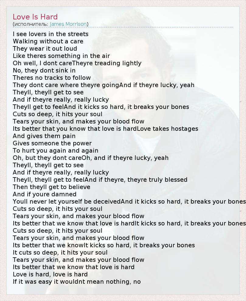 I see lovers in the streets Walking without a care They wear it out loud Like theres something in the air Oh well, I dont careTheyre treading lightly No, they dont sink in Theres no tracks to follow They dont care where theyre goingAnd if theyre lucky, yeah Theyll, theyll get to see And if theyre really, really lucky Theyll get to feelAnd it kicks so hard, it breaks your bones Cuts so deep, it hits your soul Tears your skin, and makes your blood flow Its better that you know that love is hardLove takes hostages And gives them pain Gives someone the power To hurt you again and again Oh, but they dont careOh, and if theyre lucky, yeah Theyll, theyll get to see And if theyre really, really lucky Theyll, theyll get to feelAnd if theyre, theyre truly blessed Then theyll get to believe And if youre damned Youll never let yourself be deceivedAnd it kicks so hard, it breaks your bones Cuts so deep, it hits your soul Tears your skin, and makes your blood flow Its better that we know that love is hardIt kicks so hard, it breaks your bones Cuts so deep, it hits your soul Tears your skin, and makes your blood flow Its better that we knowIt kicks so hard, it breaks your bones It cuts so deep, it hits your soul Tears your skin, and makes your blood flow Its better that we know that love is hard Love is hard, love is hard If it was easy it wouldnt mean nothing, no