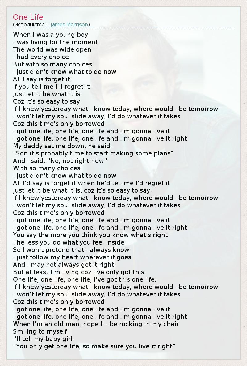 When I was a young boy I was living for the moment The world was wide open I had every choice But with so many choices I just didn't know what to do now All I say is forget it If you tell me I'll regret it Just let it be what it is Coz it's so easy to say If I knew yesterday what I know today, where would I be tomorrow I won't let my soul slide away, I'd do whatever it takes Coz this time's only borrowed I got one life, one life, one life and I'm gonna live it I got one life, one life, one life and I'm gonna live it right My daddy sat me down, he said, "Son it's probably time to start making some plans" And I said, "No, not right now" With so many choices I just didn't know what to do now All I'd say is forget it when he'd tell me I'd regret it Just let it be what it is, coz it's so easy to say. If I knew yesterday what I know today, where would I be tomorrow I won't let my soul slide away, I'd do whatever it takes Coz this time's only borrowed I got one life, one life, one life and I'm gonna live it I got one life, one life, one life and I'm gonna live it right You say the more you think you know what's right The less you do what you feel inside So I won't pretend that I always know I just follow my heart wherever it goes And I may not always get it right But at least I'm living coz I've only got this One life, one life, one life, I've got this one life. If I knew yesterday what I know today, where would I be tomorrow I won't let my soul slide away, I'd do whatever it takes Coz this time's only borrowed I got one life, one life, one life and I'm gonna live it I got one life, one life, one life and I'm gonna live it right When I'm an old man, hope I'll be rocking in my chair Smiling to myself I'll tell my baby girl "You only get one life, so make sure you live it right"