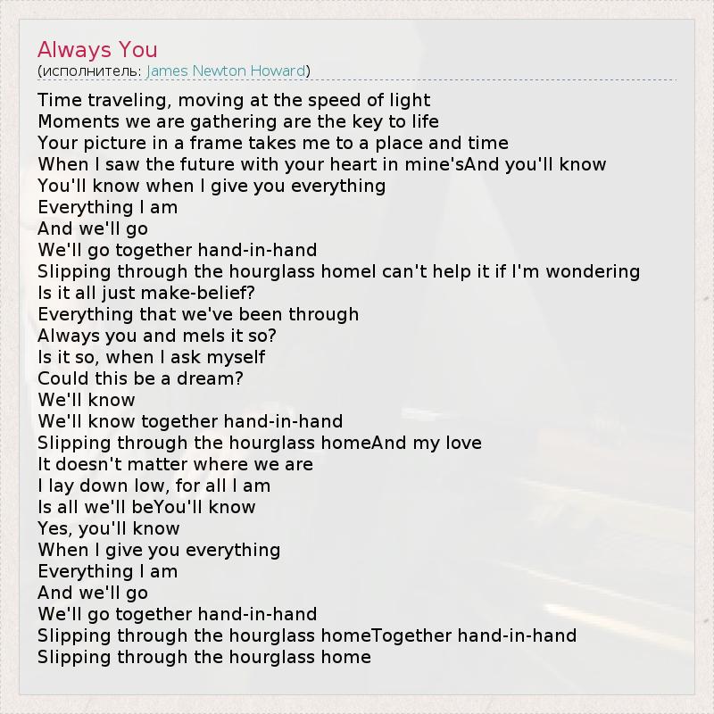 Time traveling, moving at the speed of light Moments we are gathering are the key to life Your picture in a frame takes me to a place and time When I saw the future with your heart in mine'sAnd you'll know You'll know when I give you everything Everything I am And we'll go We'll go together hand-in-hand Slipping through the hourglass homeI can't help it if I'm wondering Is it all just make-belief? Everything that we've been through Always you and meIs it so? Is it so, when I ask myself Could this be a dream? We'll know We'll know together hand-in-hand Slipping through the hourglass homeAnd my love It doesn't matter where we are I lay down low, for all I am Is all we'll beYou'll know Yes, you'll know When I give you everything Everything I am And we'll go We'll go together hand-in-hand Slipping through the hourglass homeTogether hand-in-hand Slipping through the hourglass home