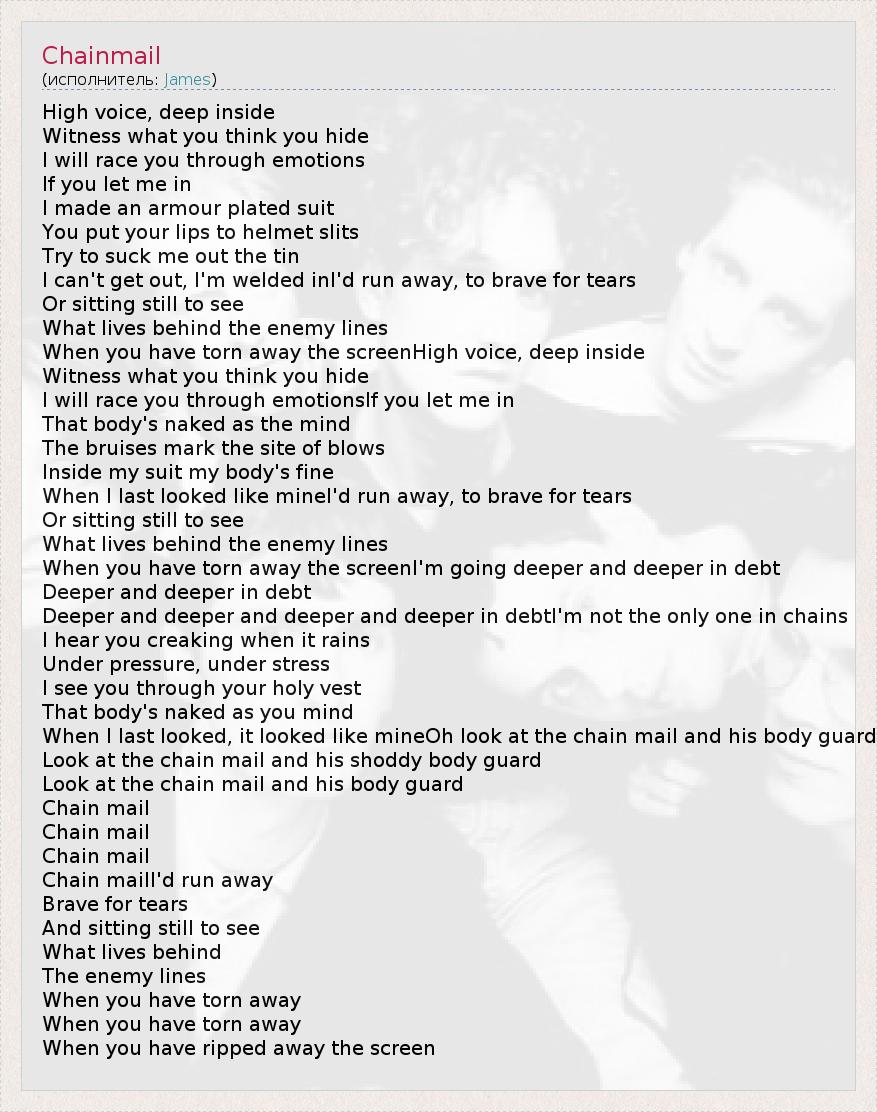 High voice, deep inside Witness what you think you hide I will race you through emotions If you let me in I made an armour plated suit You put your lips to helmet slits Try to suck me out the tin I can't get out, I'm welded inI'd run away, to brave for tears Or sitting still to see What lives behind the enemy lines When you have torn away the screenHigh voice, deep inside Witness what you think you hide I will race you through emotionsIf you let me in That body's naked as the mind The bruises mark the site of blows Inside my suit my body's fine When I last looked like mineI'd run away, to brave for tears Or sitting still to see What lives behind the enemy lines When you have torn away the screenI'm going deeper and deeper in debt Deeper and deeper in debt Deeper and deeper and deeper and deeper in debtI'm not the only one in chains I hear you creaking when it rains Under pressure, under stress I see you through your holy vest That body's naked as you mind When I last looked, it looked like mineOh look at the chain mail and his body guard Look at the chain mail and his shoddy body guard Look at the chain mail and his body guard Chain mail Chain mail Chain mail Chain mailI'd run away Brave for tears And sitting still to see What lives behind The enemy lines When you have torn away When you have torn away When you have ripped away the screen