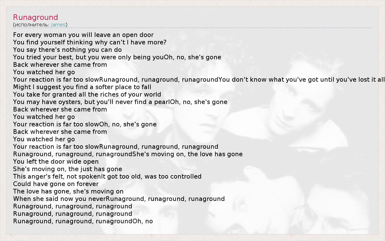 For every woman you will leave an open door You find yourself thinking why can't I have more? You say there's nothing you can do You tried your best, but you were only being youOh, no, she's gone Back wherever she came from You watched her go Your reaction is far too slowRunaground, runaground, runagroundYou don't know what you've got until you've lost it all Might I suggest you find a softer place to fall You take for granted all the riches of your world You may have oysters, but you'll never find a pearlOh, no, she's gone Back wherever she came from You watched her go Your reaction is far too slowOh, no, she's gone Back wherever she came from You watched her go Your reaction is far too slowRunaground, runaground, runaground Runaground, runaground, runagroundShe's moving on, the love has gone You left the door wide open She's moving on, the just has gone This anger's felt, not spokenIt got too old, was too controlled Could have gone on forever The love has gone, she's moving on When she said now you neverRunaground, runaground, runaground Runaground, runaground, runaground Runaground, runaground, runaground Runaground, runaground, runagroundOh, no
