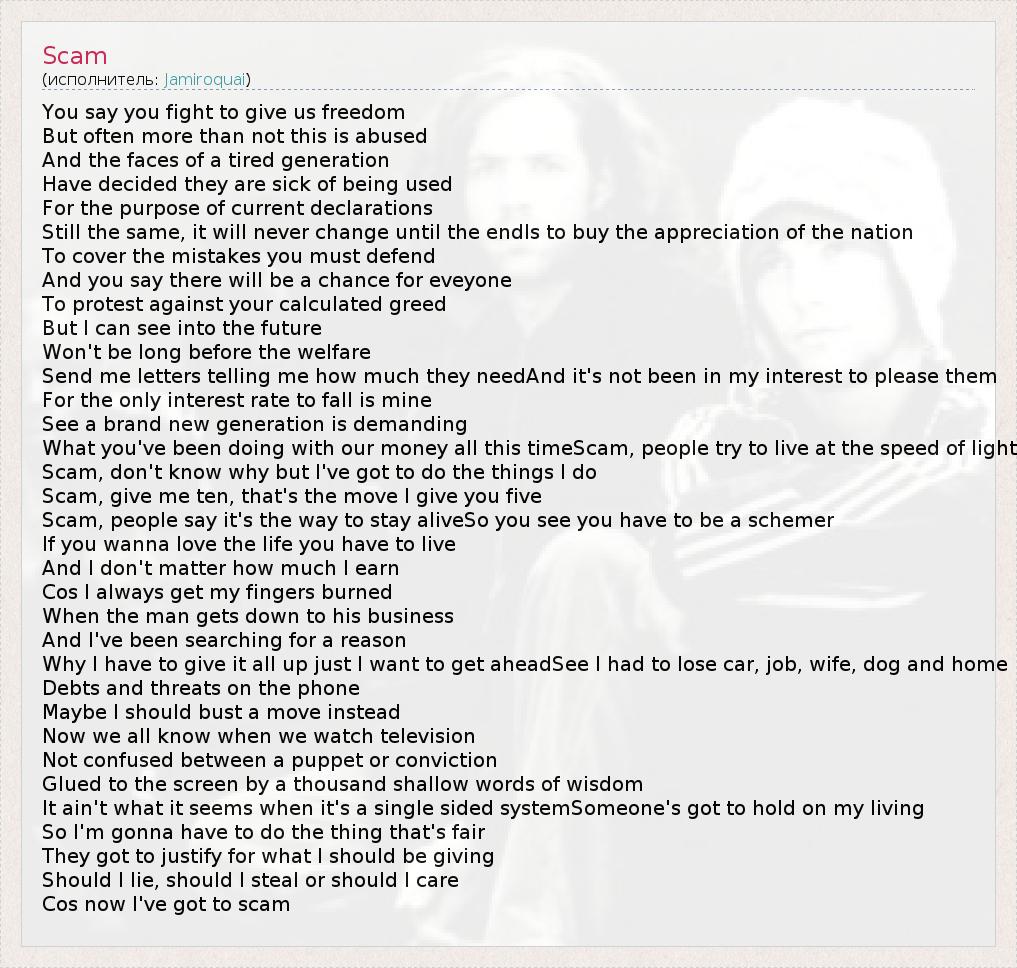 You say you fight to give us freedom But often more than not this is abused And the faces of a tired generation Have decided they are sick of being used For the purpose of current declarations Still the same, it will never change until the endIs to buy the appreciation of the nation To cover the mistakes you must defend And you say there will be a chance for eveyone To protest against your calculated greed But I can see into the future Won't be long before the welfare Send me letters telling me how much they needAnd it's not been in my interest to please them For the only interest rate to fall is mine See a brand new generation is demanding What you've been doing with our money all this timeScam, people try to live at the speed of light Scam, don't know why but I've got to do the things I do Scam, give me ten, that's the move I give you five Scam, people say it's the way to stay aliveSo you see you have to be a schemer If you wanna love the life you have to live And I don't matter how much I earn Cos I always get my fingers burned When the man gets down to his business And I've been searching for a reason Why I have to give it all up just I want to get aheadSee I had to lose car, job, wife, dog and home Debts and threats on the phone Maybe I should bust a move instead Now we all know when we watch television Not confused between a puppet or conviction Glued to the screen by a thousand shallow words of wisdom It ain't what it seems when it's a single sided systemSomeone's got to hold on my living So I'm gonna have to do the thing that's fair They got to justify for what I should be giving Should I lie, should I steal or should I care Cos now I've got to scam