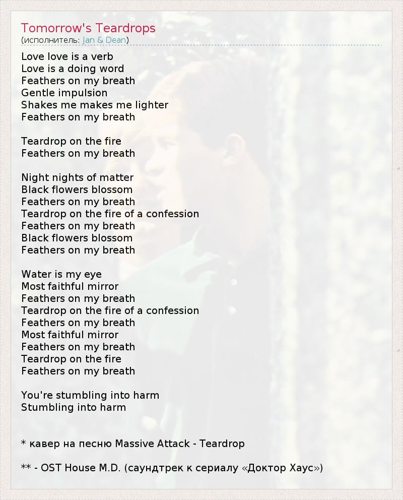 Love love is a verb Love is a doing word Feathers on my breath Gentle impulsion Shakes me makes me lighter Feathers on my breath Teardrop on the fire Feathers on my breath Night nights of matter Black flowers blossom Feathers on my breath Teardrop on the fire of a confession Feathers on my breath Black flowers blossom Feathers on my breath Water is my eye Most faithful mirror Feathers on my breath Teardrop on the fire of a confession Feathers on my breath Most faithful mirror Feathers on my breath Teardrop on the fire Feathers on my breath You're stumbling into harm Stumbling into harm * кавер на песню Massive Attack - Teardrop ** - OST House M.D. (саундтрек к сериалу «Доктор Хаус»)
