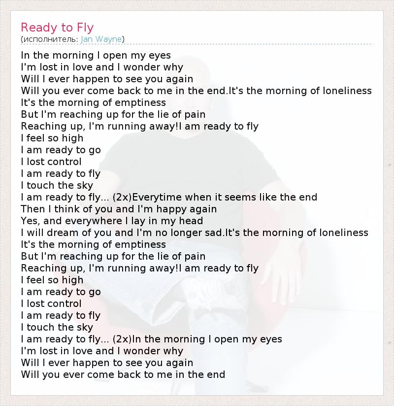 In the morning I open my eyes I'm lost in love and I wonder why Will I ever happen to see you again Will you ever come back to me in the end.It's the morning of loneliness It's the morning of emptiness But I'm reaching up for the lie of pain Reaching up, I'm running away!I am ready to fly I feel so high I am ready to go I lost control I am ready to fly I touch the sky I am ready to fly... (2x)Everytime when it seems like the end Then I think of you and I'm happy again Yes, and everywhere I lay in my head I will dream of you and I'm no longer sad.It's the morning of loneliness It's the morning of emptiness But I'm reaching up for the lie of pain Reaching up, I'm running away!I am ready to fly I feel so high I am ready to go I lost control I am ready to fly I touch the sky I am ready to fly... (2x)In the morning I open my eyes I'm lost in love and I wonder why Will I ever happen to see you again Will you ever come back to me in the end