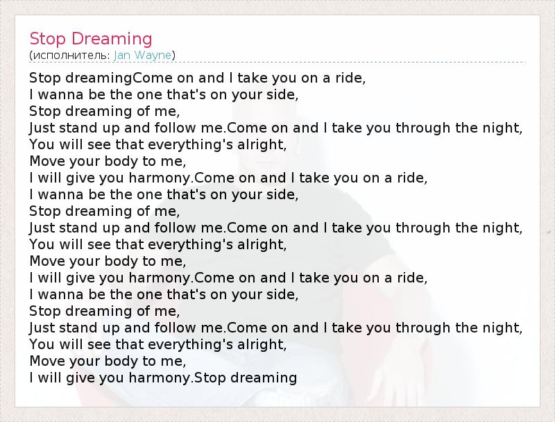 Stop dreamingCome on and I take you on a ride, I wanna be the one that's on your side, Stop dreaming of me, Just stand up and follow me.Come on and I take you through the night, You will see that everything's alright, Move your body to me, I will give you harmony.Come on and I take you on a ride, I wanna be the one that's on your side, Stop dreaming of me, Just stand up and follow me.Come on and I take you through the night, You will see that everything's alright, Move your body to me, I will give you harmony.Come on and I take you on a ride, I wanna be the one that's on your side, Stop dreaming of me, Just stand up and follow me.Come on and I take you through the night, You will see that everything's alright, Move your body to me, I will give you harmony.Stop dreaming