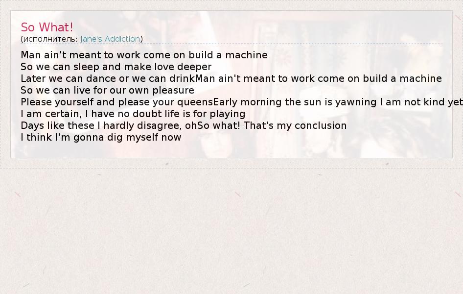 Это интересно:Jane’s Addiction — американская рок-группа, считающаяся одним из пионеров стиля альтернативный рок, сформированная в 1985 году, в Лос-Анджелесе. В оригинальный состав группы входили: Перри Фаррелл (вокал), Дэйв Наварро (гитара), Эрик Эвери (бас) и... продолжение