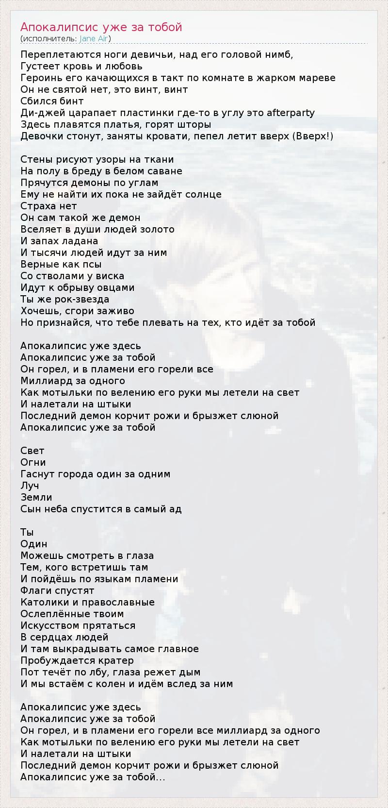 Jane Air - Апокалипсис уже за тобой - Текст песни, слушать онлайн Jane Air - Апокалипсис уже за тобой - Текст песни, слушать онлайн