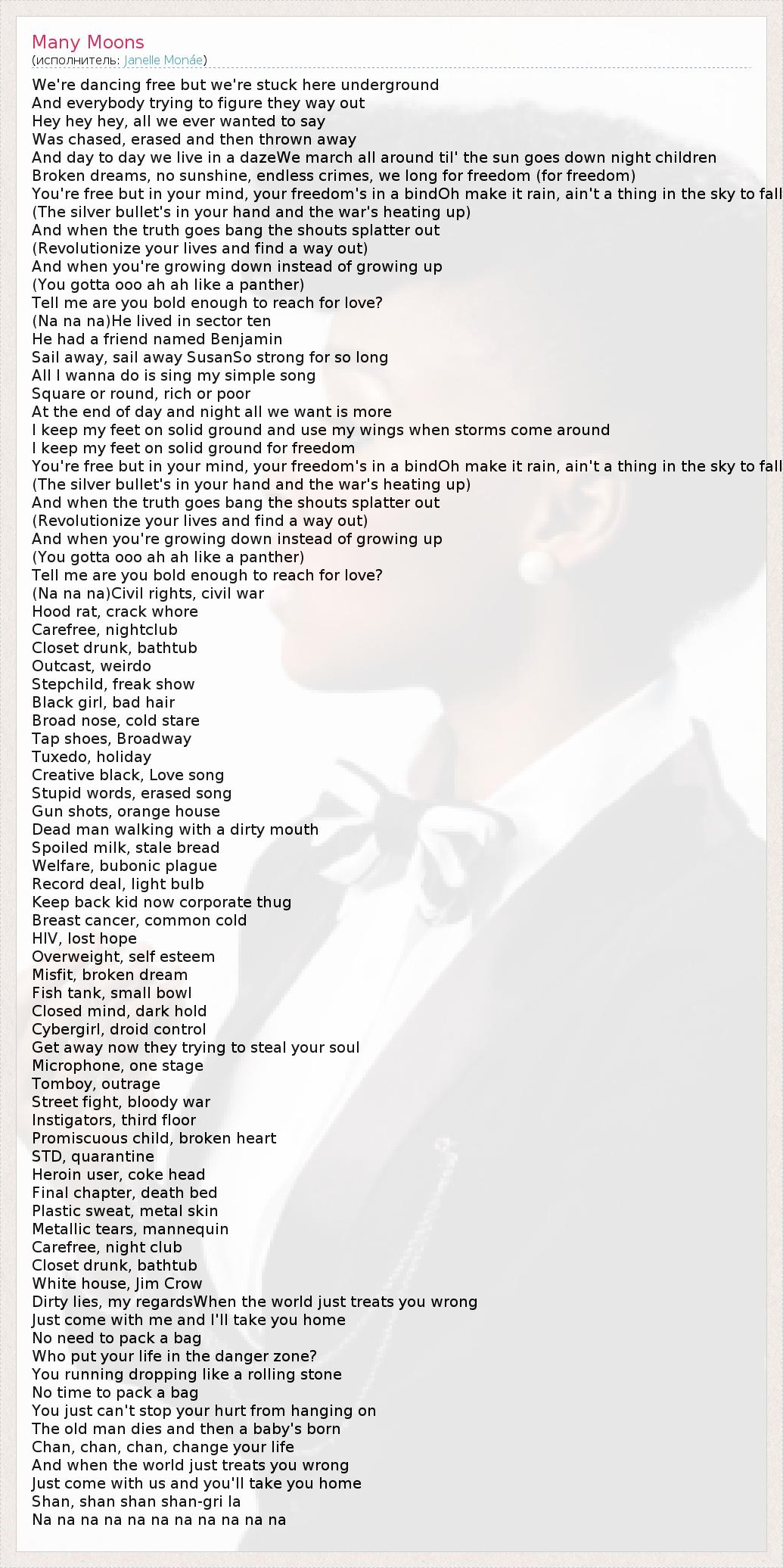 Это интересно:Джанель Монэ (Janelle Monáe, настоящее имя - Janelle Monáe Robinson) родилась 1 декабря 1985 года в городе Канзас-Сити, штат Канзас (Kansas City, Kansas). Сразу после окончания школы переехала в Нью-Йорк (New York City), где поступила в Американскую Музыкальную и Драматическую Академию (The American Musical and Dramatic Academy). Начав свое обучение на факультете театральных искусств, Джанель вскоре поняла, что не намерена начинать карьеру... продолжение