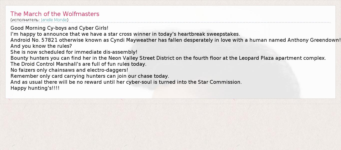 ГлавнаяИсполнителиJanelle MonáeThe March of the Wolfmasters