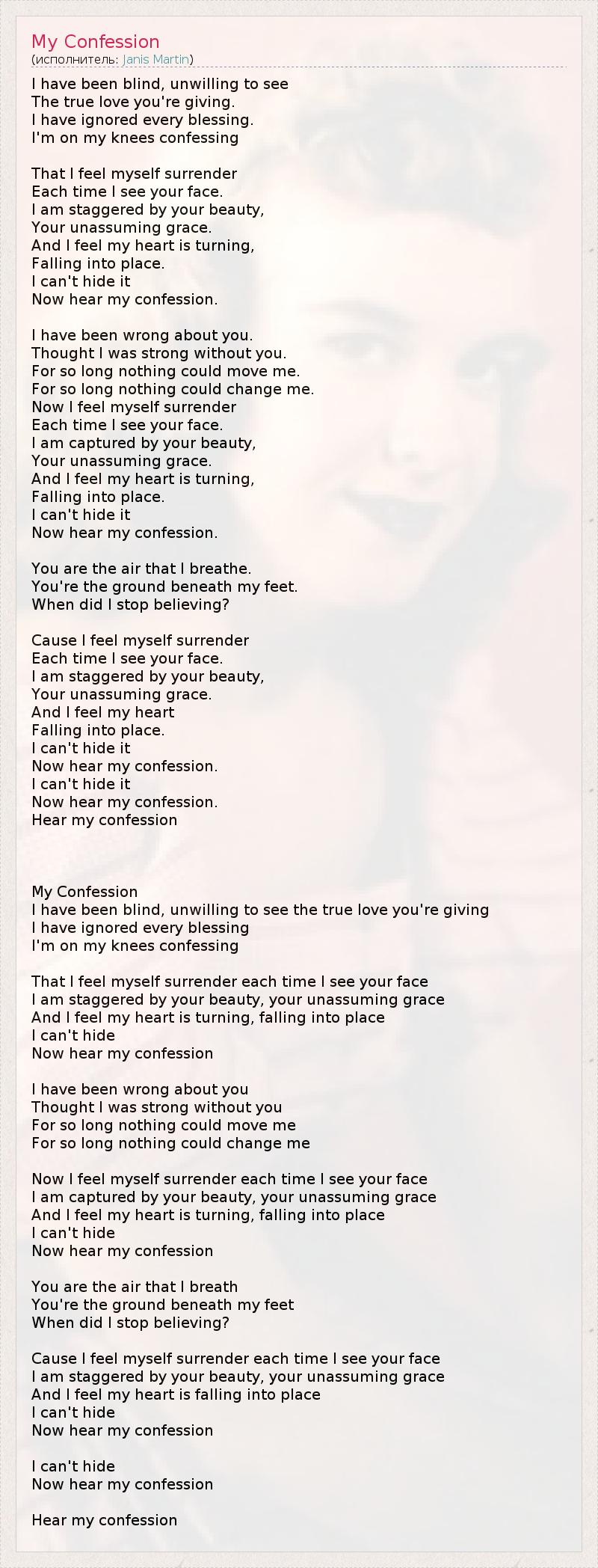 I have been blind, unwilling to see The true love you're giving. I have ignored every blessing. I'm on my knees confessing That I feel myself surrender Each time I see your face. I am staggered by your beauty, Your unassuming grace. And I feel my heart is turning, Falling into place. I can't hide it Now hear my confession. I have been wrong about you. Thought I was strong without you. For so long nothing could move me. For so long nothing could change me. Now I feel myself surrender Each time I see your face. I am captured by your beauty, Your unassuming grace. And I feel my heart is turning, Falling into place. I can't hide it Now hear my confession. You are the air that I breathe. You're the ground beneath my feet. When did I stop believing? Cause I feel myself surrender Each time I see your face. I am staggered by your beauty, Your unassuming grace. And I feel my heart Falling into place. I can't hide it Now hear my confession. I can't hide it Now hear my confession. Hear my confession My Confession I have been blind, unwilling to see the true love you're giving I have ignored every blessing I'm on my knees confessing That I feel myself surrender each time I see your face I am staggered by your beauty, your unassuming grace And I feel my heart is turning, falling into place I can't hide Now hear my confession I have been wrong about you Thought I was strong without you For so long nothing could move me For so long nothing could change me Now I feel myself surrender each time I see your face I am captured by your beauty, your unassuming grace And I feel my heart is turning, falling into place I can't hide Now hear my confession You are the air that I breath You're the ground beneath my feet When did I stop believing? Cause I feel myself surrender each time I see your face I am staggered by your beauty, your unassuming grace And I feel my heart is falling into place I can't hide Now hear my confession I can't hide Now hear my confession Hear my confession