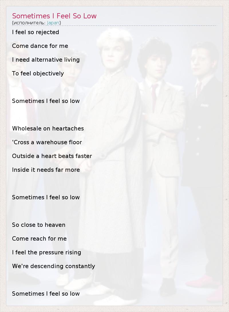 I feel so rejected Come dance for me I need alternative living To feel objectively Sometimes I feel so low Wholesale on heartaches 'Cross a warehouse floor Outside a heart beats faster Inside it needs far more Sometimes I feel so low So close to heaven Come reach for me I feel the pressure rising We're descending constantly Sometimes I feel so low