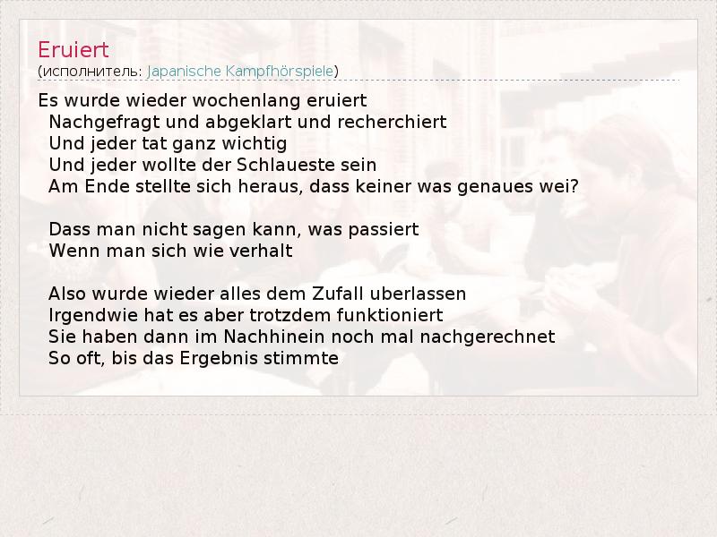Es wurde wieder wochenlang eruiert Nachgefragt und abgeklart und recherchiert Und jeder tat ganz wichtig Und jeder wollte der Schlaueste sein Am Ende stellte sich heraus, dass keiner was genaues wei? Dass man nicht sagen kann, was passiert Wenn man sich wie verhalt Also wurde wieder alles dem Zufall uberlassen Irgendwie hat es aber trotzdem funktioniert Sie haben dann im Nachhinein noch mal nachgerechnet So oft, bis das Ergebnis stimmte