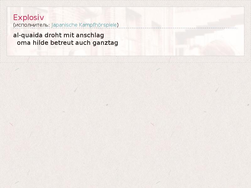 Это интересно:Japanische Kampfhörspiele образовались как полноценнная грайндкор формация в 1998-м году в городе Krefeld в Германии. Главным инициатором выступил гитарист Klaus Nicodem. В дальнейшем, после выхода первого официального лонгплея, состав команды стабилизировался до того, чтобы можно было давать живые выступления. В переводе на инглиш название банды звучит как "Japanese Combat Radio Plays." На более поздних релизах... продолжение
