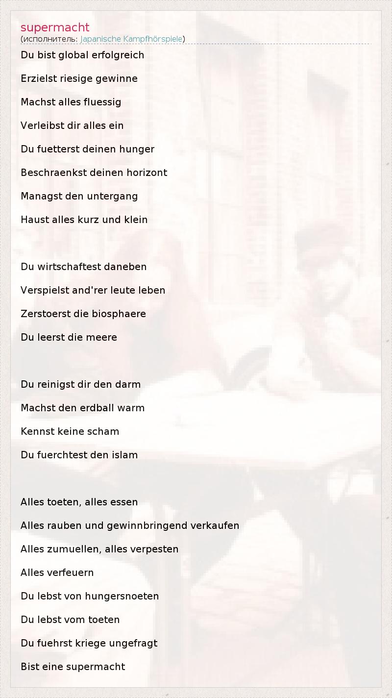 Du bist global erfolgreich Erzielst riesige gewinne Machst alles fluessig Verleibst dir alles ein Du fuetterst deinen hunger Beschraenkst deinen horizont Managst den untergang Haust alles kurz und klein Du wirtschaftest daneben Verspielst and'rer leute leben Zerstoerst die biosphaere Du leerst die meere Du reinigst dir den darm Machst den erdball warm Kennst keine scham Du fuerchtest den islam Alles toeten, alles essen Alles rauben und gewinnbringend verkaufen Alles zumuellen, alles verpesten Alles verfeuern Du lebst von hungersnoeten Du lebst vom toeten Du fuehrst kriege ungefragt Bist eine supermacht