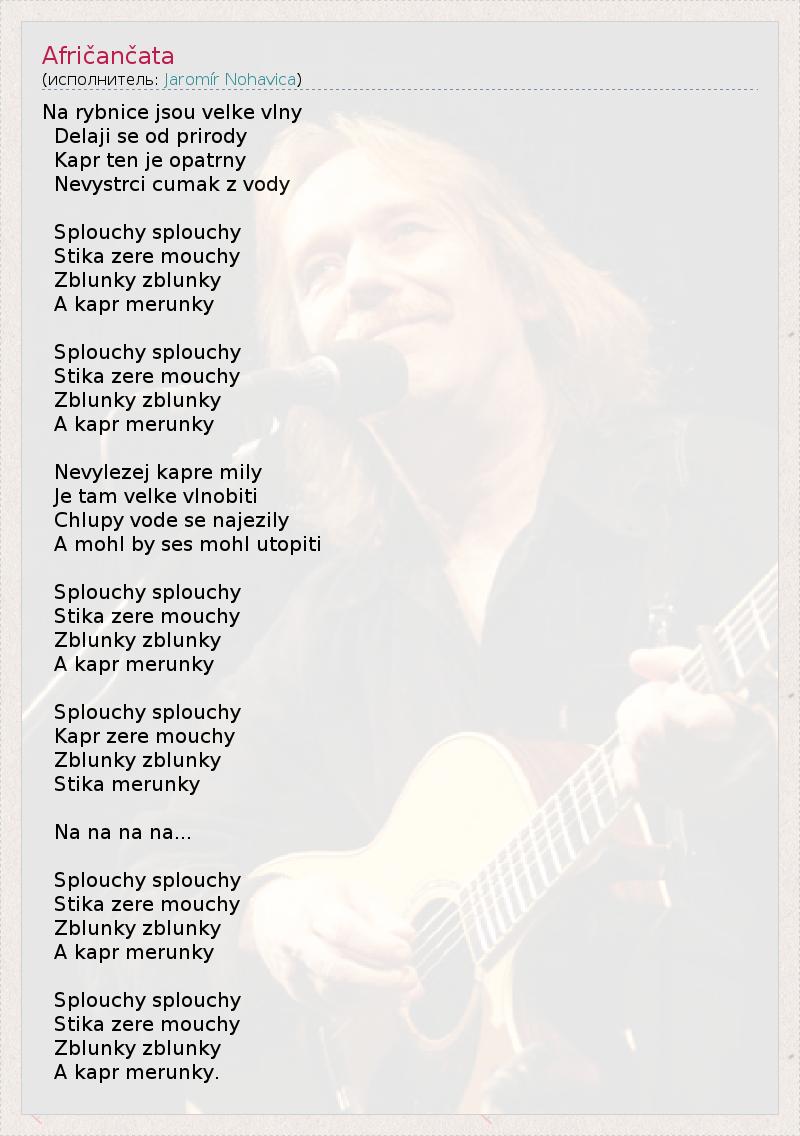 Это интересно:Я́ромир Но́гавица, известный также как Я́рек Ногавица — чешский поэт, композитор, мультиинструменталист, автор и исполнитель песен. Родился 7 июня 1953 г. в Остраве. Закончив среднюю общеобразовательную школу и школу библиотечного искусства в Брно, он поступил в политехнический университет горного дела в Остраве, но не закончил обучение.Ногавица начал играть на гитаре с 13 лет. Несмотря... продолжение