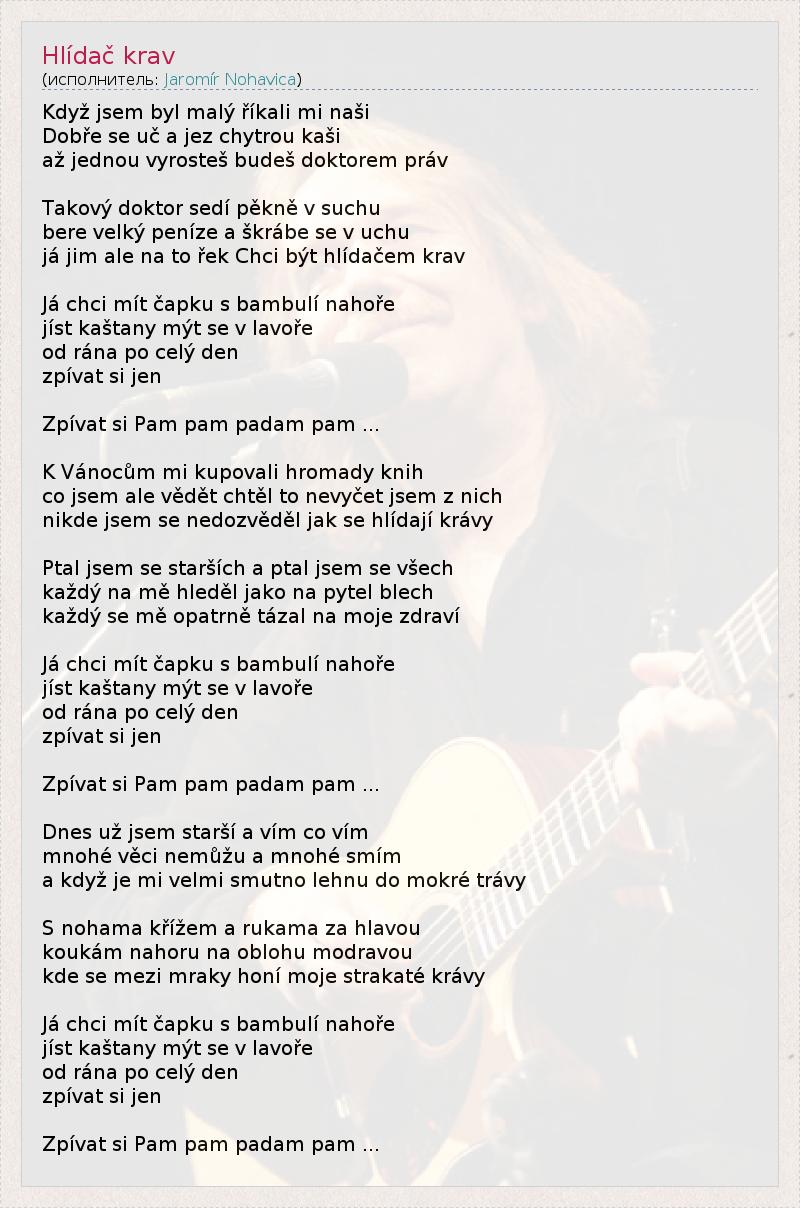 Это интересно:Я́ромир Но́гавица, известный также как Я́рек Ногавица — чешский поэт, композитор, мультиинструменталист, автор и исполнитель песен. Родился 7 июня 1953 г. в Остраве. Закончив среднюю общеобразовательную школу и школу библиотечного искусства в Брно, он поступил в политехнический университет горного дела в Остраве, но не закончил обучение.Ногавица начал играть на гитаре с 13 лет. Несмотря... продолжение