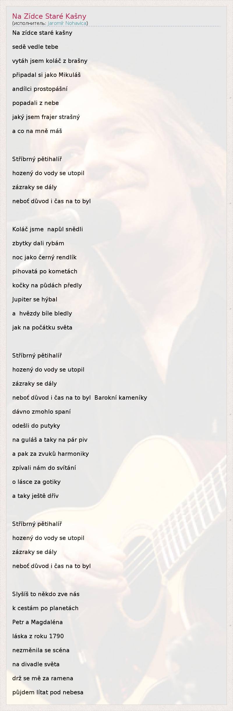 Это интересно:Я́ромир Но́гавица, известный также как Я́рек Ногавица — чешский поэт, композитор, мультиинструменталист, автор и исполнитель песен. Родился 7 июня 1953 г. в Остраве. Закончив среднюю общеобразовательную школу и школу библиотечного искусства в Брно, он поступил в политехнический университет горного дела в Остраве, но не закончил обучение.Ногавица начал играть на гитаре с 13 лет. Несмотря... продолжение