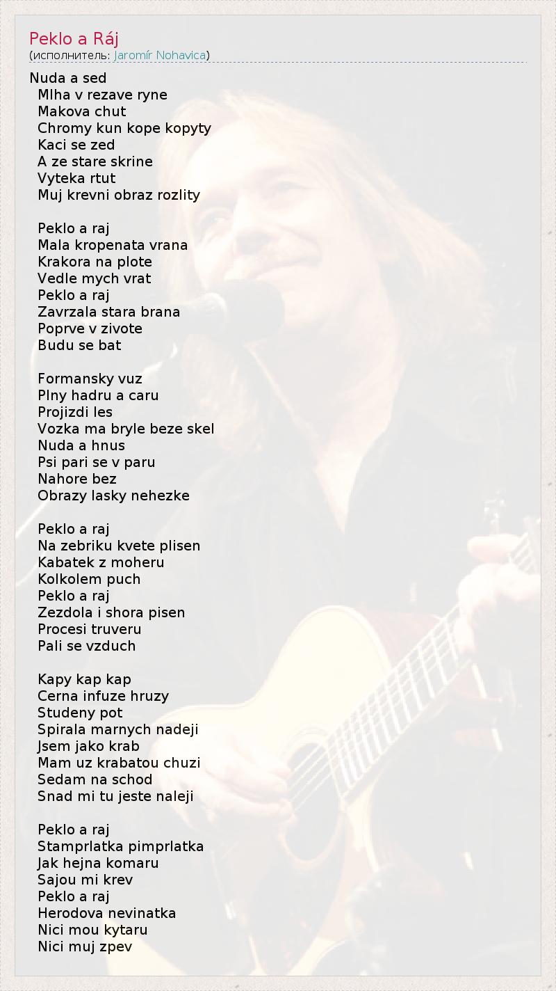 Nuda a sed Mlha v rezave ryne Makova chut Chromy kun kope kopyty Kaci se zed A ze stare skrine Vyteka rtut Muj krevni obraz rozlity Peklo a raj Mala kropenata vrana Krakora na plote Vedle mych vrat Peklo a raj Zavrzala stara brana Poprve v zivote Budu se bat Formansky vuz Plny hadru a caru Projizdi les Vozka ma bryle beze skel Nuda a hnus Psi pari se v paru Nahore bez Obrazy lasky nehezke Peklo a raj Na zebriku kvete plisen Kabatek z moheru Kolkolem puch Peklo a raj Zezdola i shora pisen Procesi truveru Pali se vzduch Kapy kap kap Cerna infuze hruzy Studeny pot Spirala marnych nadeji Jsem jako krab Mam uz krabatou chuzi Sedam na schod Snad mi tu jeste naleji Peklo a raj Stamprlatka pimprlatka Jak hejna komaru Sajou mi krev Peklo a raj Herodova nevinatka Nici mou kytaru Nici muj zpev