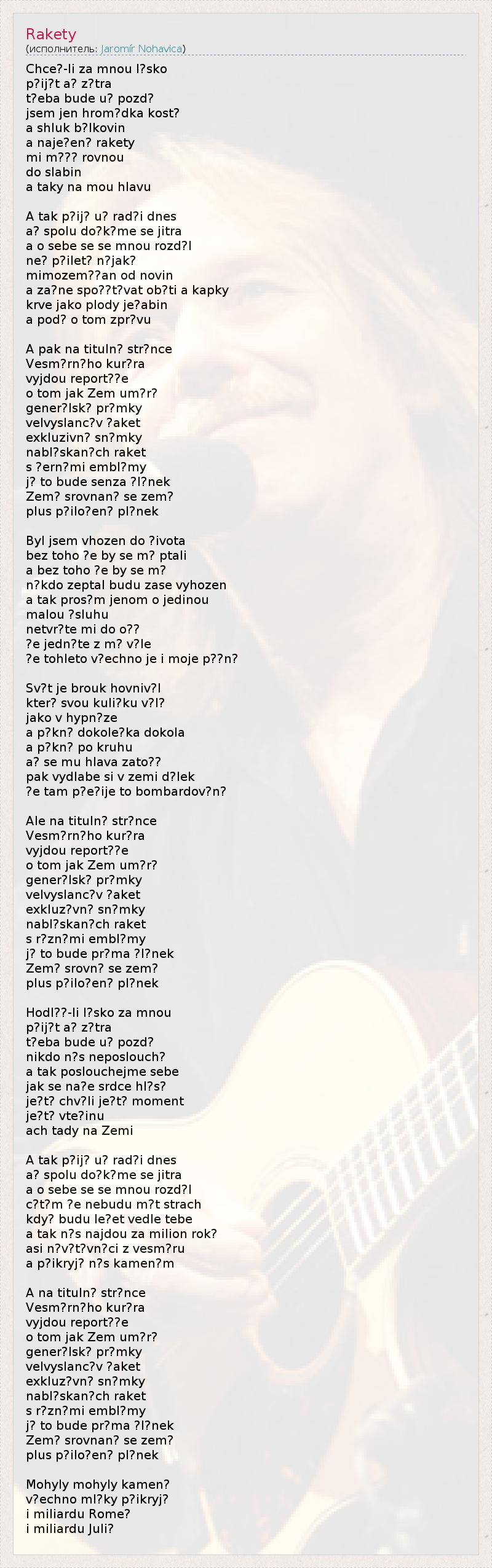 Это интересно:Я́ромир Но́гавица, известный также как Я́рек Ногавица — чешский поэт, композитор, мультиинструменталист, автор и исполнитель песен. Родился 7 июня 1953 г. в Остраве. Закончив среднюю общеобразовательную школу и школу библиотечного искусства в Брно, он поступил в политехнический университет горного дела в Остраве, но не закончил обучение.Ногавица начал играть на гитаре с 13 лет. Несмотря... продолжение