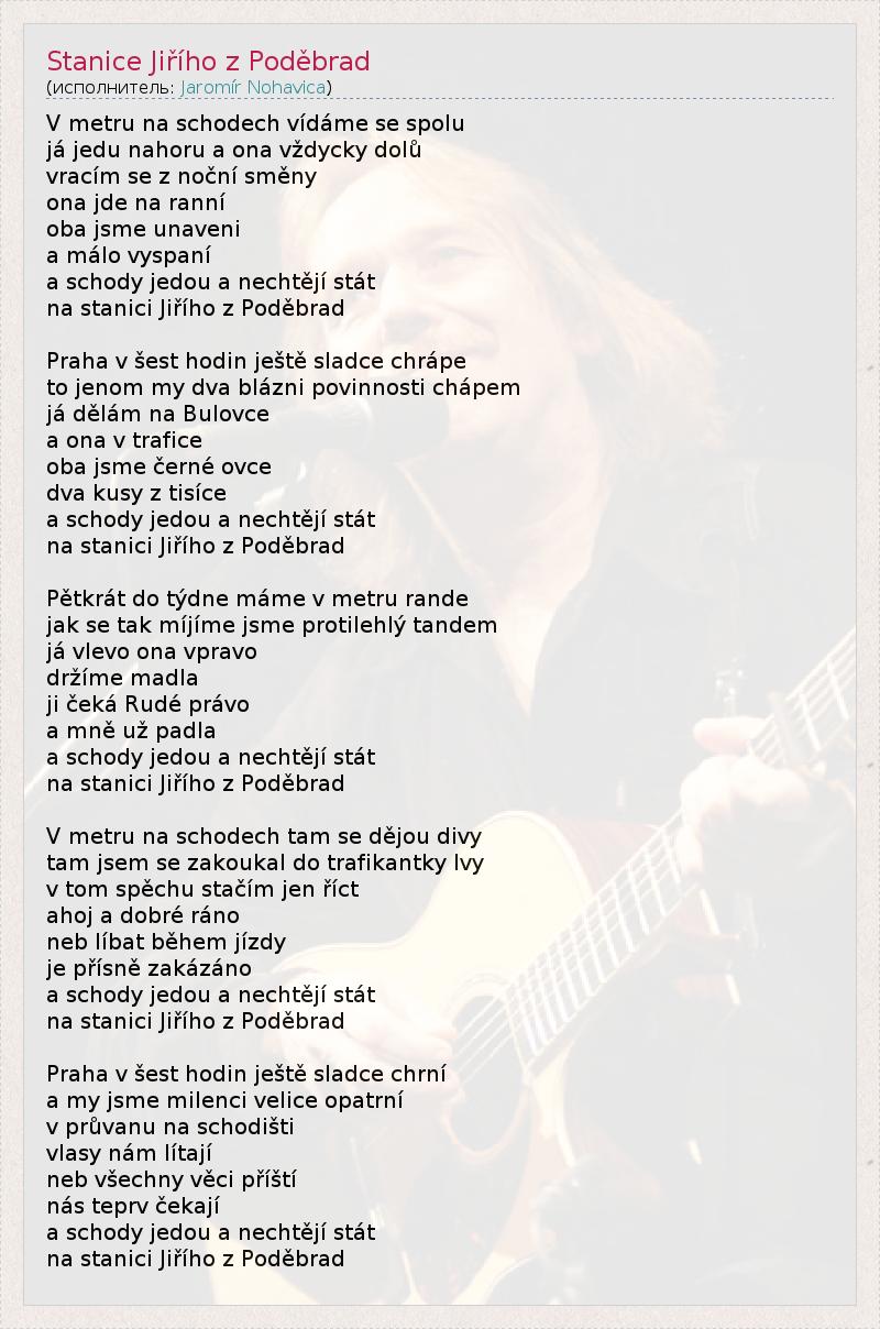 V metru na schodech vídáme se spolu já jedu nahoru a ona vždycky dolů vracím se z noční směny ona jde na ranní oba jsme unaveni a málo vyspaní a schody jedou a nechtějí stát na stanici Jiřího z Poděbrad Praha v šest hodin ještě sladce chrápe to jenom my dva blázni povinnosti chápem já dělám na Bulovce a ona v trafice oba jsme černé ovce dva kusy z tisíce a schody jedou a nechtějí stát na stanici Jiřího z Poděbrad Pětkrát do týdne máme v metru rande jak se tak míjíme jsme protilehlý tandem já vlevo ona vpravo držíme madla ji čeká Rudé právo a mně už padla a schody jedou a nechtějí stát na stanici Jiřího z Poděbrad V metru na schodech tam se dějou divy tam jsem se zakoukal do trafikantky Ivy v tom spěchu stačím jen říct ahoj a dobré ráno neb líbat během jízdy je přísně zakázáno a schody jedou a nechtějí stát na stanici Jiřího z Poděbrad Praha v šest hodin ještě sladce chrní a my jsme milenci velice opatrní v průvanu na schodišti vlasy nám lítají neb všechny věci příští nás teprv čekají a schody jedou a nechtějí stát na stanici Jiřího z Poděbrad