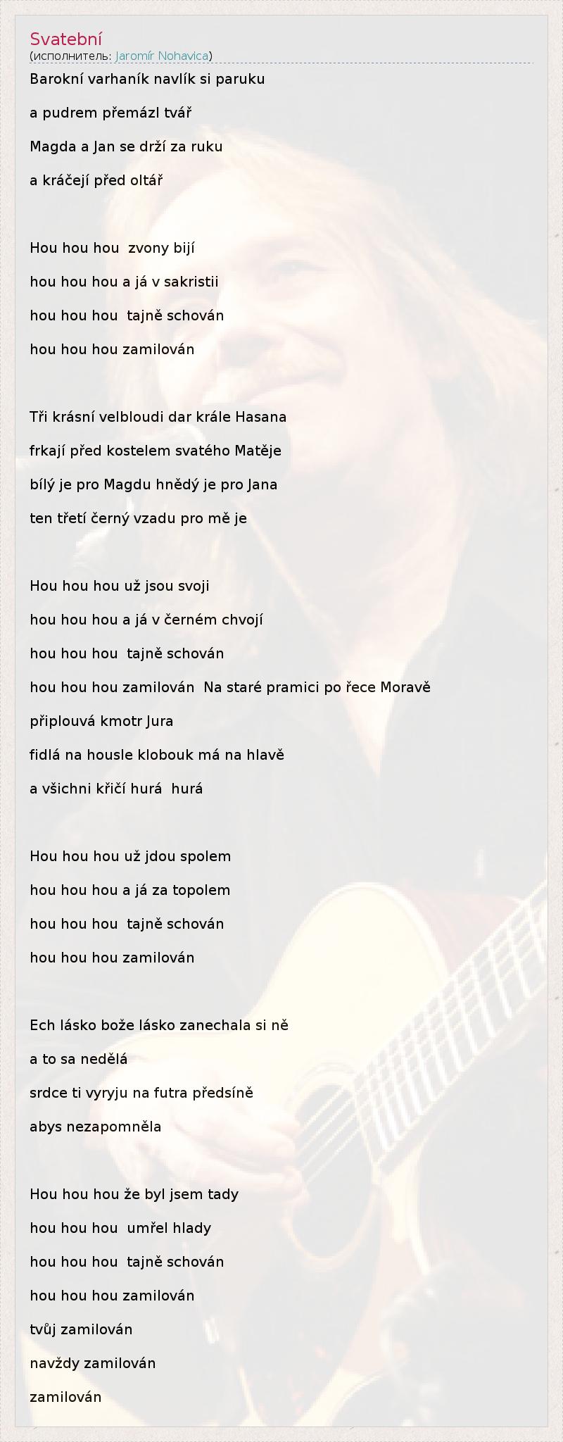 Это интересно:Я́ромир Но́гавица, известный также как Я́рек Ногавица — чешский поэт, композитор, мультиинструменталист, автор и исполнитель песен. Родился 7 июня 1953 г. в Остраве. Закончив среднюю общеобразовательную школу и школу библиотечного искусства в Брно, он поступил в политехнический университет горного дела в Остраве, но не закончил обучение.Ногавица начал играть на гитаре с 13 лет. Несмотря... продолжение