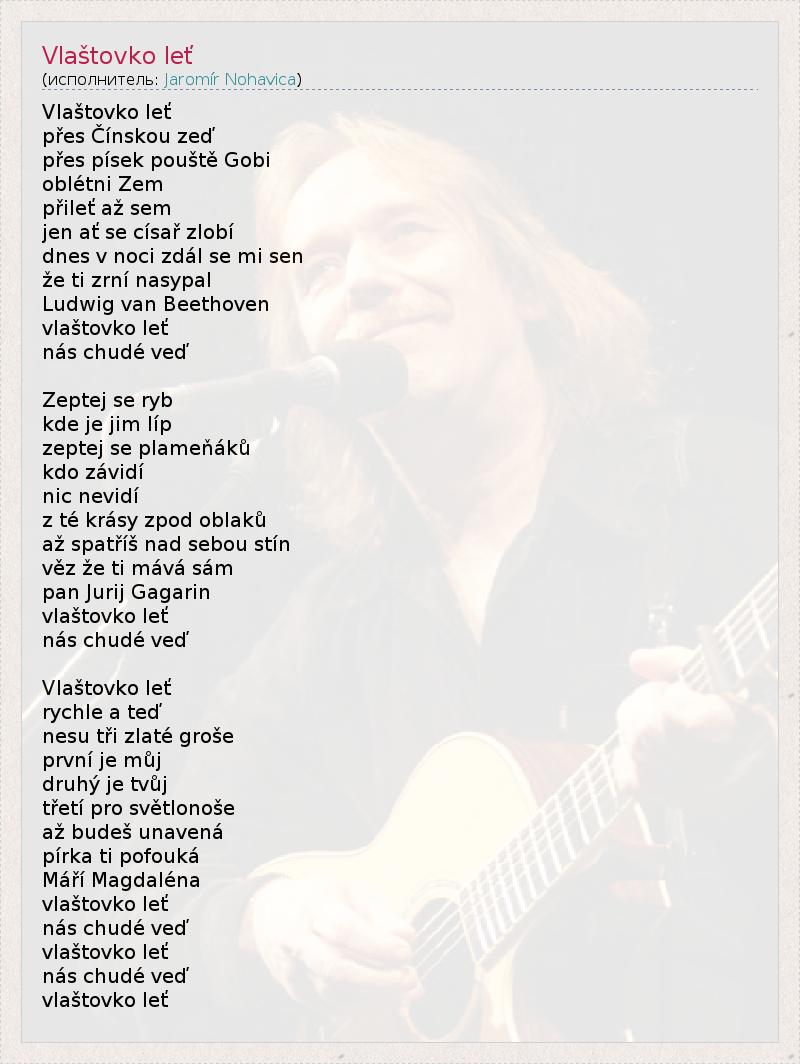 Это интересно:Я́ромир Но́гавица, известный также как Я́рек Ногавица — чешский поэт, композитор, мультиинструменталист, автор и исполнитель песен. Родился 7 июня 1953 г. в Остраве. Закончив среднюю общеобразовательную школу и школу библиотечного искусства в Брно, он поступил в политехнический университет горного дела в Остраве, но не закончил обучение.Ногавица начал играть на гитаре с 13 лет. Несмотря... продолжение