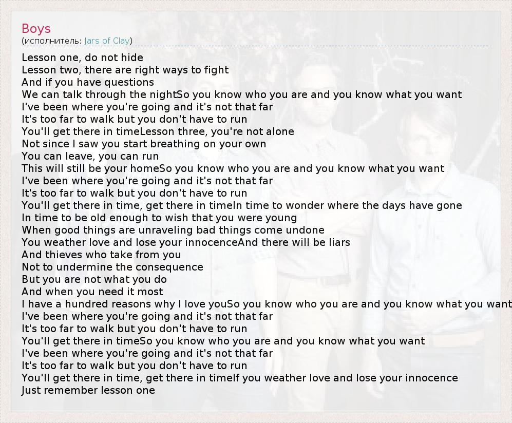 Lesson one, do not hide Lesson two, there are right ways to fight And if you have questions We can talk through the nightSo you know who you are and you know what you want I've been where you're going and it's not that far It's too far to walk but you don't have to run You'll get there in timeLesson three, you're not alone Not since I saw you start breathing on your own You can leave, you can run This will still be your homeSo you know who you are and you know what you want I've been where you're going and it's not that far It's too far to walk but you don't have to run You'll get there in time, get there in timeIn time to wonder where the days have gone In time to be old enough to wish that you were young When good things are unraveling bad things come undone You weather love and lose your innocenceAnd there will be liars And thieves who take from you Not to undermine the consequence But you are not what you do And when you need it most I have a hundred reasons why I love youSo you know who you are and you know what you want I've been where you're going and it's not that far It's too far to walk but you don't have to run You'll get there in timeSo you know who you are and you know what you want I've been where you're going and it's not that far It's too far to walk but you don't have to run You'll get there in time, get there in timeIf you weather love and lose your innocence Just remember lesson one