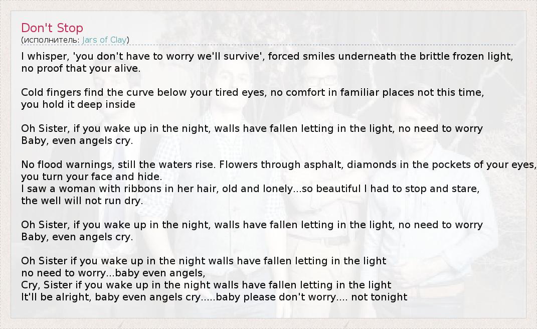 I whisper, 'you don't have to worry we'll survive', forced smiles underneath the brittle frozen light, no proof that your alive. Cold fingers find the curve below your tired eyes, no comfort in familiar places not this time, you hold it deep inside Oh Sister, if you wake up in the night, walls have fallen letting in the light, no need to worry Baby, even angels cry. No flood warnings, still the waters rise. Flowers through asphalt, diamonds in the pockets of your eyes, you turn your face and hide. I saw a woman with ribbons in her hair, old and lonely...so beautiful I had to stop and stare, the well will not run dry. Oh Sister, if you wake up in the night, walls have fallen letting in the light, no need to worry Baby, even angels cry. Oh Sister if you wake up in the night walls have fallen letting in the light no need to worry...baby even angels, Cry, Sister if you wake up in the night walls have fallen letting in the light It'll be alright, baby even angels cry.....baby please don't worry.... not tonight