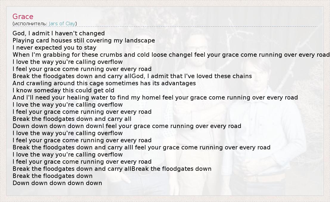 God, I admit I haven't changed Playing card houses still covering my landscape I never expected you to stay When I'm grabbing for these crumbs and cold loose changeI feel your grace come running over every road I love the way you're calling overflow I feel your grace come running over every road Break the floodgates down and carry allGod, I admit that I've loved these chains And crawling around this cage sometimes has its advantages I know someday this could get old And I'll need your healing water to find my homeI feel your grace come running over every road I love the way you're calling overflow I feel your grace come running over every road Break the floodgates down and carry all Down down down down downI feel your grace come running over every road I love the way you're calling overflow I feel your grace come running over every road Break the floodgates down and carry allI feel your grace come running over every road I love the way you're calling overflow I feel your grace come running over every road Break the floodgates down and carry allBreak the floodgates down Break the floodgates down Down down down down down