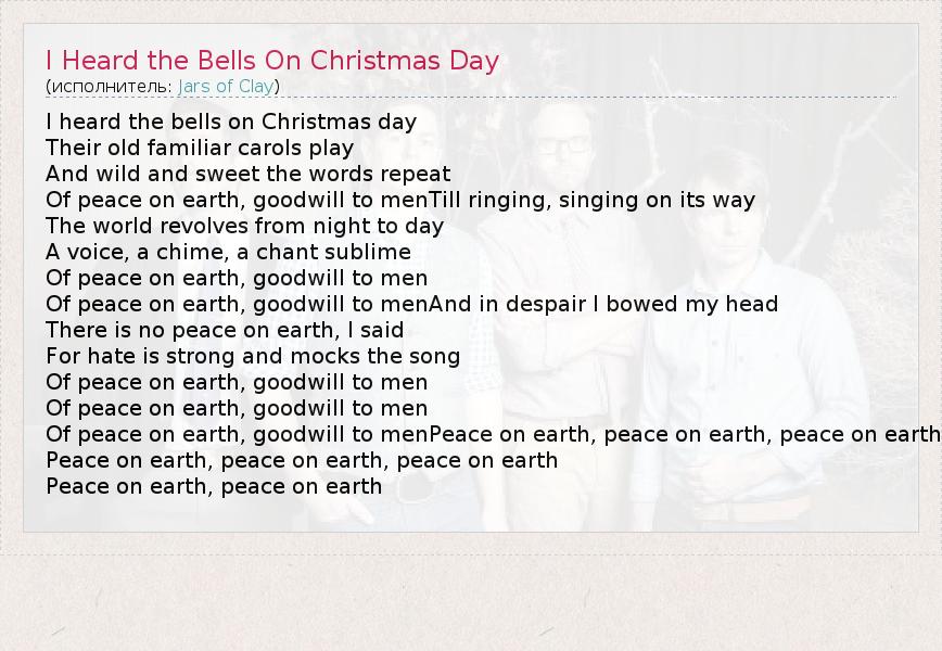 I heard the bells on Christmas day Their old familiar carols play And wild and sweet the words repeat Of peace on earth, goodwill to menTill ringing, singing on its way The world revolves from night to day A voice, a chime, a chant sublime Of peace on earth, goodwill to men Of peace on earth, goodwill to menAnd in despair I bowed my head There is no peace on earth, I said For hate is strong and mocks the song Of peace on earth, goodwill to men Of peace on earth, goodwill to men Of peace on earth, goodwill to menPeace on earth, peace on earth, peace on earth Peace on earth, peace on earth, peace on earth Peace on earth, peace on earth