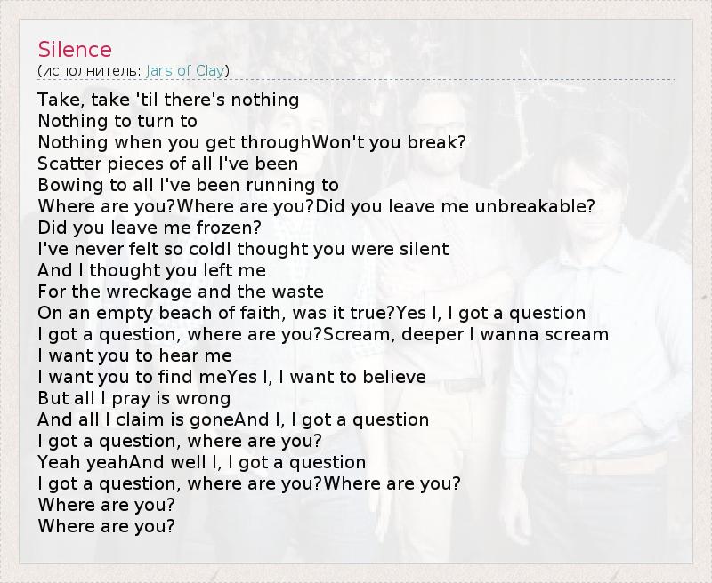 Это интересно:Дэн Хаселтайн, Стив Мэсон и Чарли Лавелл основали Jars of clay в 1993-м, когда учились на втором курсе Гринвилльского колледжа (Гринвилль, Штат Иллинойс). Дэн и Чарли были соседями по комнате в университетском общежитии и вместе пытались писать песни, пока не познакомились со Стивом. Дэн рос в музыкальной атмосфере, а его брат Мэтью играл в составе группы Marzuki, лидером которой был знаменитый... продолжение