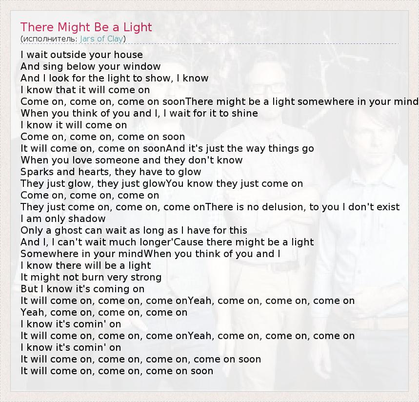 I wait outside your house And sing below your window And I look for the light to show, I know I know that it will come on Come on, come on, come on soonThere might be a light somewhere in your mind When you think of you and I, I wait for it to shine I know it will come on Come on, come on, come on soon It will come on, come on soonAnd it's just the way things go When you love someone and they don't know Sparks and hearts, they have to glow They just glow, they just glowYou know they just come on Come on, come on, come on They just come on, come on, come onThere is no delusion, to you I don't exist I am only shadow Only a ghost can wait as long as I have for this And I, I can't wait much longer'Cause there might be a light Somewhere in your mindWhen you think of you and I I know there will be a light It might not burn very strong But I know it's coming on It will come on, come on, come onYeah, come on, come on, come on Yeah, come on, come on, come on I know it's comin' on It will come on, come on, come onYeah, come on, come on, come on I know it's comin' on It will come on, come on, come on, come on soon It will come on, come on, come on soon