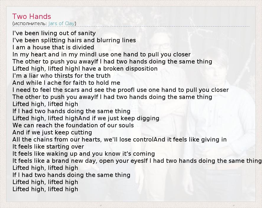 I've been living out of sanity I've been splitting hairs and blurring lines I am a house that is divided In my heart and in my mindI use one hand to pull you closer The other to push you awayIf I had two hands doing the same thing Lifted high, lifted highI have a broken disposition I'm a liar who thirsts for the truth And while I ache for faith to hold me I need to feel the scars and see the proofI use one hand to pull you closer The other to push you awayIf I had two hands doing the same thing Lifted high, lifted high If I had two hands doing the same thing Lifted high, lifted highAnd if we just keep digging We can reach the foundation of our souls And if we just keep cutting All the chains from our hearts, we'll lose controlAnd it feels like giving in It feels like starting over It feels like waking up and you know it's coming It feels like a brand new day, open your eyesIf I had two hands doing the same thing Lifted high, lifted high If I had two hands doing the same thing Lifted high, lifted high Lifted high, lifted high