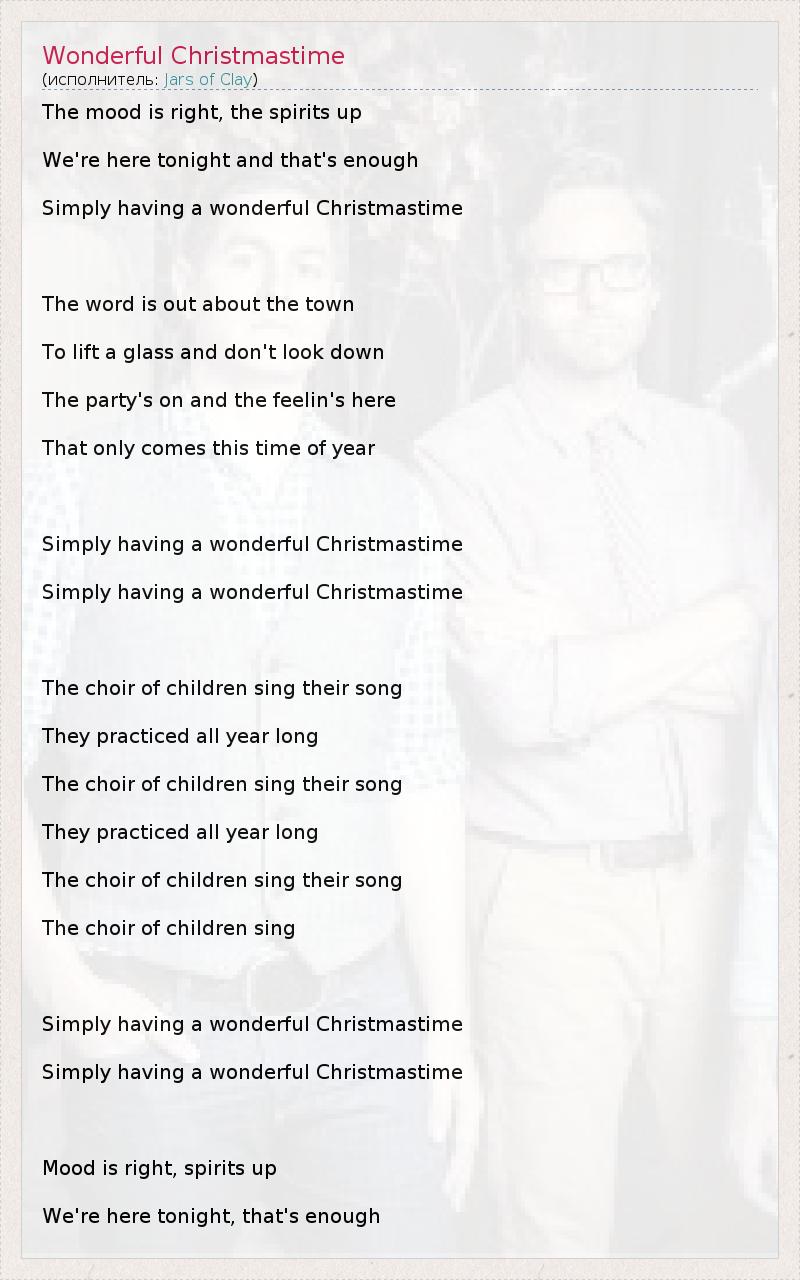 The mood is right, the spirits up We're here tonight and that's enough Simply having a wonderful Christmastime The word is out about the town To lift a glass and don't look down The party's on and the feelin's here That only comes this time of year Simply having a wonderful Christmastime Simply having a wonderful Christmastime The choir of children sing their song They practiced all year long The choir of children sing their song They practiced all year long The choir of children sing their song The choir of children sing Simply having a wonderful Christmastime Simply having a wonderful Christmastime Mood is right, spirits up We're here tonight, that's enough