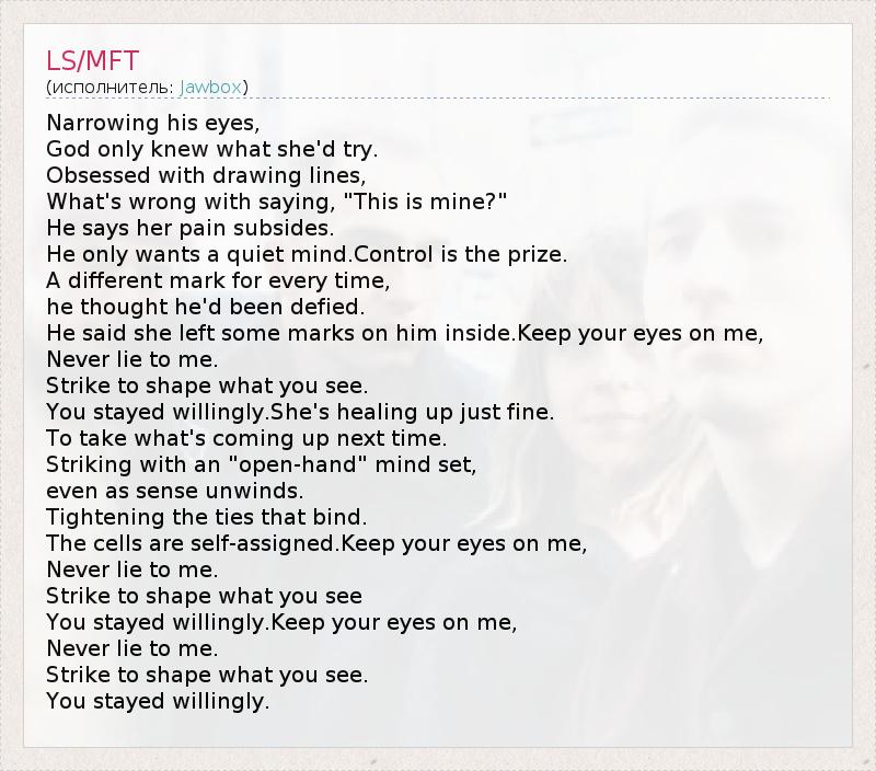 Narrowing his eyes, God only knew what she'd try. Obsessed with drawing lines, What's wrong with saying, "This is mine?" He says her pain subsides. He only wants a quiet mind.Control is the prize. A different mark for every time, he thought he'd been defied. He said she left some marks on him inside.Keep your eyes on me, Never lie to me. Strike to shape what you see. You stayed willingly.She's healing up just fine. To take what's coming up next time. Striking with an "open-hand" mind set, even as sense unwinds. Tightening the ties that bind. The cells are self-assigned.Keep your eyes on me, Never lie to me. Strike to shape what you see You stayed willingly.Keep your eyes on me, Never lie to me. Strike to shape what you see. You stayed willingly.