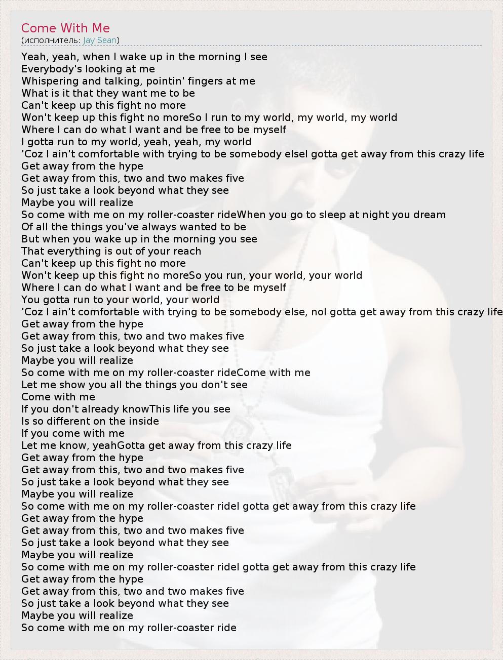 Yeah, yeah, when I wake up in the morning I see Everybody's looking at me Whispering and talking, pointin' fingers at me What is it that they want me to be Can't keep up this fight no more Won't keep up this fight no moreSo I run to my world, my world, my world Where I can do what I want and be free to be myself I gotta run to my world, yeah, yeah, my world 'Coz I ain't comfortable with trying to be somebody elseI gotta get away from this crazy life Get away from the hype Get away from this, two and two makes five So just take a look beyond what they see Maybe you will realize So come with me on my roller-coaster rideWhen you go to sleep at night you dream Of all the things you've always wanted to be But when you wake up in the morning you see That everything is out of your reach Can't keep up this fight no more Won't keep up this fight no moreSo you run, your world, your world Where I can do what I want and be free to be myself You gotta run to your world, your world 'Coz I ain't comfortable with trying to be somebody else, noI gotta get away from this crazy life Get away from the hype Get away from this, two and two makes five So just take a look beyond what they see Maybe you will realize So come with me on my roller-coaster rideCome with me Let me show you all the things you don't see Come with me If you don't already knowThis life you see Is so different on the inside If you come with me Let me know, yeahGotta get away from this crazy life Get away from the hype Get away from this, two and two makes five So just take a look beyond what they see Maybe you will realize So come with me on my roller-coaster rideI gotta get away from this crazy life Get away from the hype Get away from this, two and two makes five So just take a look beyond what they see Maybe you will realize So come with me on my roller-coaster rideI gotta get away from this crazy life Get away from the hype Get away from this, two and two makes five So just take a look beyond what they see Maybe you will realize So come with me on my roller-coaster ride