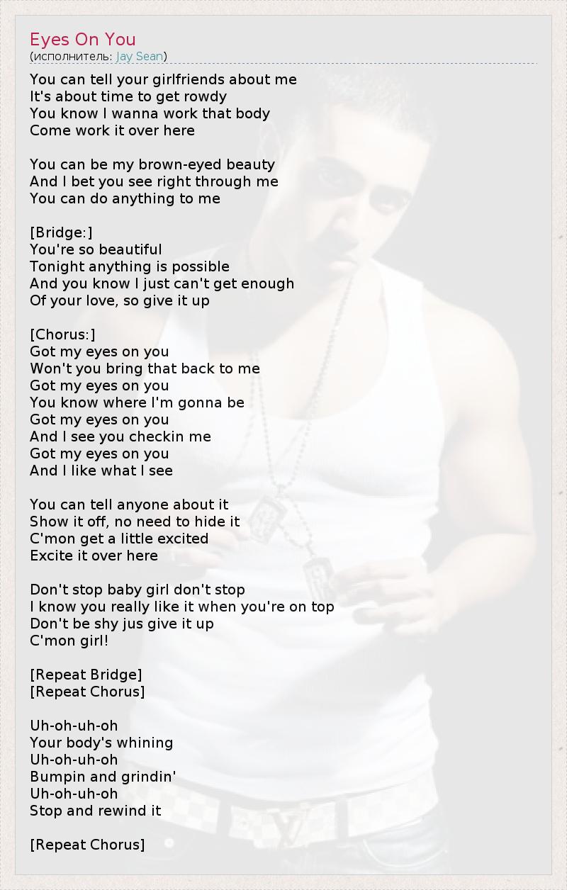 You can tell your girlfriends about me It's about time to get rowdy You know I wanna work that body Come work it over here You can be my brown-eyed beauty And I bet you see right through me You can do anything to me [Bridge:] You're so beautiful Tonight anything is possible And you know I just can't get enough Of your love, so give it up [Chorus:] Got my eyes on you Won't you bring that back to me Got my eyes on you You know where I'm gonna be Got my eyes on you And I see you checkin me Got my eyes on you And I like what I see You can tell anyone about it Show it off, no need to hide it C'mon get a little excited Excite it over here Don't stop baby girl don't stop I know you really like it when you're on top Don't be shy jus give it up C'mon girl! [Repeat Bridge] [Repeat Chorus] Uh-oh-uh-oh Your body's whining Uh-oh-uh-oh Bumpin and grindin' Uh-oh-uh-oh Stop and rewind it [Repeat Chorus]
