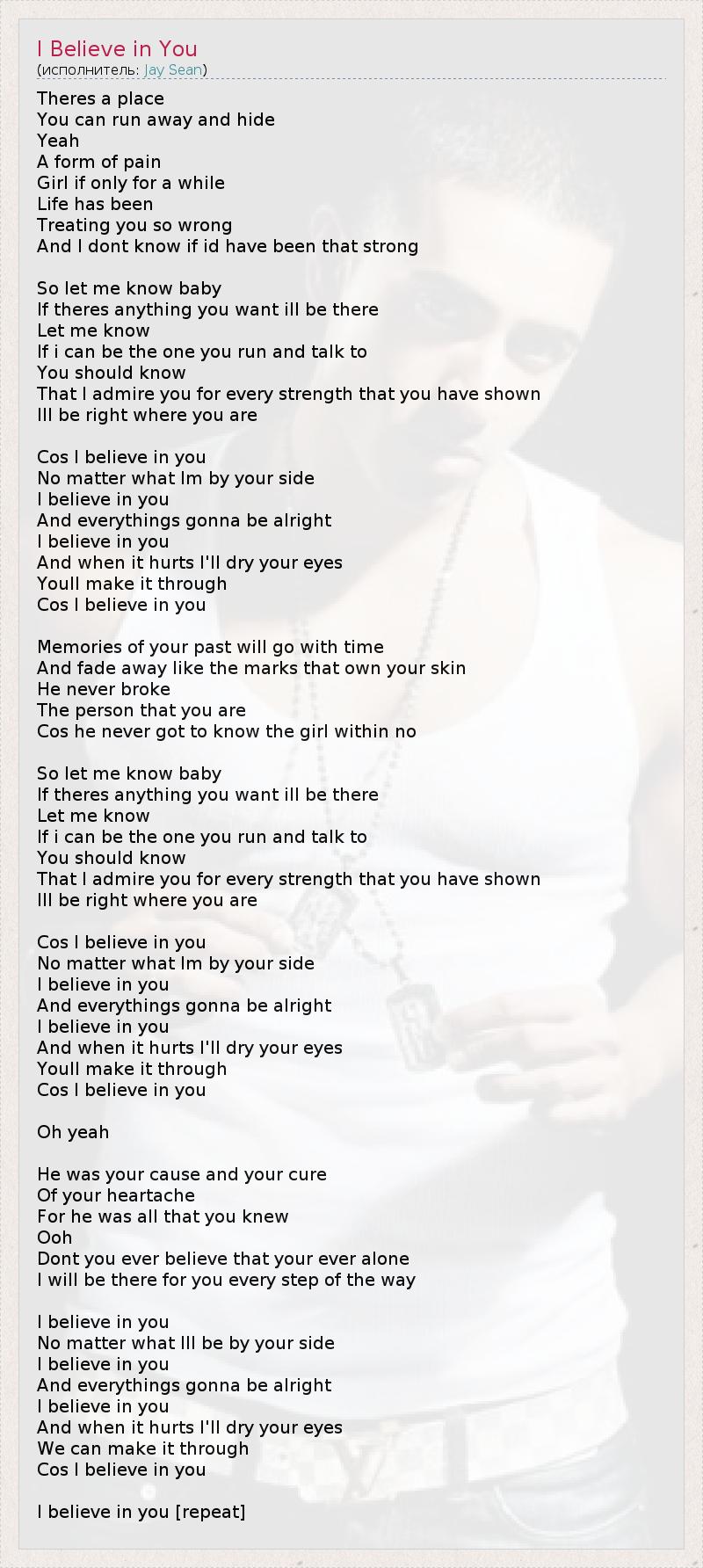 Есть место, куда ты можешь убежать и спрятаться От боли, но это лишь ненадолго, Потому что жизнь была с тобой жестока, И я не знаю, смог бы я быть настолько сильным. [Переход:] Так что, позволь мне узнать тебя, детка. Если тебе что-то понадобится – я буду рядом. Дай мне знать. Если я могу быть тем единственным, к кому ты можешь убежать и поговорить, Ты должна знать, Что я восхищаюсь тобой за ту силу, что ты проявила. [Припев:] Потому что я верю в тебя, И несмотря ни на что, я буду на твоей стороне.... Я верю в тебя, Всё будет хорошо, Я верю в тебя.... И когда будет больно, я подставлю своё плечо, Ты пройдёшь через это, Потому что я верю в тебя.... Воспоминания прошлого останутся со мной, Сгладятся, как морщинки на твоей коже. Он никогда не сломит человека, как ты, Потому что никогда не знал такой девушки. [Переход:] Так что, позволь мне узнать тебя, детка. Если тебе что-то понадобится – я буду рядом. Дай мне знать. Если я могу быть тем единственным, к кому ты можешь убежать и поговорить, Ты должна знать, Что я восхищаюсь тобой за ту силу, что ты проявила. [Припев:] Потому что я верю в тебя, И несмотря ни на что, я буду на твоей стороне.... Я верю в тебя, Всё будет хорошо, Я верю в тебя.... И когда будет больно, я подставлю своё плечо, Ты пройдёшь через это, Потому что я верю в тебя.... Он был причиной и лекарством от головной боли, Потому что он был всем, что ты знала. Ты веришь, что навеки одна?! Я буду рядом с тобой, На каждом шагу твоей жизни. [2х:] Я сказал, что верю в тебя. Оооо… Ты можешь пройти через это. Потому что я верю в тебя.