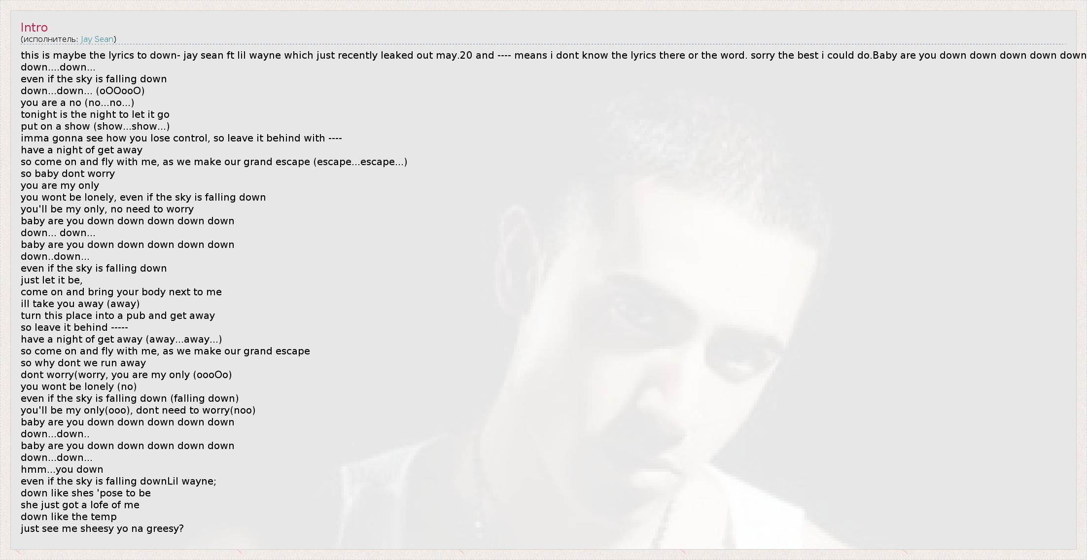 this is maybe the lyrics to down- jay sean ft lil wayne which just recently leaked out may.20 and ---- means i dont know the lyrics there or the word. sorry the best i could do.Baby are you down down down down down down....down... even if the sky is falling down down...down... (oOOooO) you are a no (no...no...) tonight is the night to let it go put on a show (show...show...) imma gonna see how you lose control, so leave it behind with ---- have a night of get away so come on and fly with me, as we make our grand escape (escape...escape...) so baby dont worry you are my only you wont be lonely, even if the sky is falling down you'll be my only, no need to worry baby are you down down down down down down... down... baby are you down down down down down down..down... even if the sky is falling down just let it be, come on and bring your body next to me ill take you away (away) turn this place into a pub and get away so leave it behind ----- have a night of get away (away...away...) so come on and fly with me, as we make our grand escape so why dont we run away dont worry(worry, you are my only (oooOo) you wont be lonely (no) even if the sky is falling down (falling down) you'll be my only(ooo), dont need to worry(noo) baby are you down down down down down down...down.. baby are you down down down down down down...down... hmm...you down even if the sky is falling downLil wayne; down like shes 'pose to be she just got a lofe of me down like the temp just see me sheesy yo na greesy?