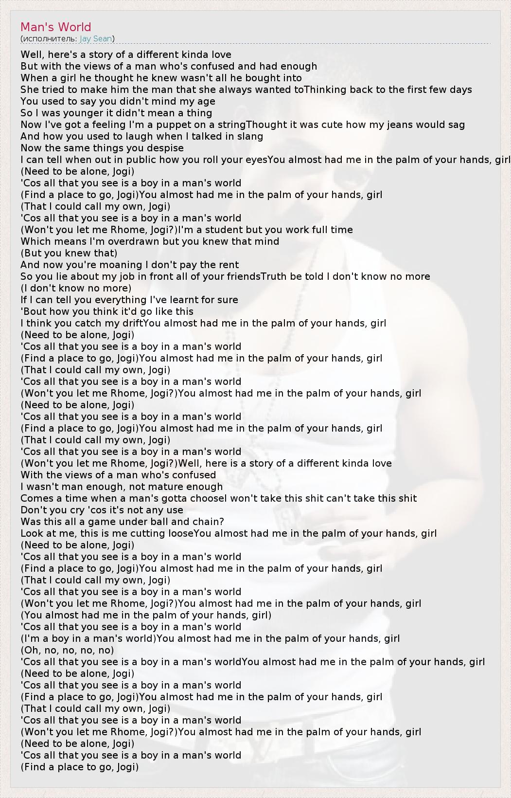 Well, here's a story of a different kinda love But with the views of a man who's confused and had enough When a girl he thought he knew wasn't all he bought into She tried to make him the man that she always wanted toThinking back to the first few days You used to say you didn't mind my age So I was younger it didn't mean a thing Now I've got a feeling I'm a puppet on a stringThought it was cute how my jeans would sag And how you used to laugh when I talked in slang Now the same things you despise I can tell when out in public how you roll your eyesYou almost had me in the palm of your hands, girl (Need to be alone, Jogi) 'Cos all that you see is a boy in a man's world (Find a place to go, Jogi)You almost had me in the palm of your hands, girl (That I could call my own, Jogi) 'Cos all that you see is a boy in a man's world (Won't you let me Rhome, Jogi?)I'm a student but you work full time Which means I'm overdrawn but you knew that mind (But you knew that) And now you're moaning I don't pay the rent So you lie about my job in front all of your friendsTruth be told I don't know no more (I don't know no more) If I can tell you everything I've learnt for sure 'Bout how you think it'd go like this I think you catch my driftYou almost had me in the palm of your hands, girl (Need to be alone, Jogi) 'Cos all that you see is a boy in a man's world (Find a place to go, Jogi)You almost had me in the palm of your hands, girl (That I could call my own, Jogi) 'Cos all that you see is a boy in a man's world (Won't you let me Rhome, Jogi?)You almost had me in the palm of your hands, girl (Need to be alone, Jogi) 'Cos all that you see is a boy in a man's world (Find a place to go, Jogi)You almost had me in the palm of your hands, girl (That I could call my own, Jogi) 'Cos all that you see is a boy in a man's world (Won't you let me Rhome, Jogi?)Well, here is a story of a different kinda love With the views of a man who's confused I wasn't man enough, not mature enough Comes a time when a man's gotta chooseI won't take this shit can't take this shit Don't you cry 'cos it's not any use Was this all a game under ball and chain? Look at me, this is me cutting looseYou almost had me in the palm of your hands, girl (Need to be alone, Jogi) 'Cos all that you see is a boy in a man's world (Find a place to go, Jogi)You almost had me in the palm of your hands, girl (That I could call my own, Jogi) 'Cos all that you see is a boy in a man's world (Won't you let me Rhome, Jogi?)You almost had me in the palm of your hands, girl (You almost had me in the palm of your hands, girl) 'Cos all that you see is a boy in a man's world (I'm a boy in a man's world)You almost had me in the palm of your hands, girl (Oh, no, no, no, no) 'Cos all that you see is a boy in a man's worldYou almost had me in the palm of your hands, girl (Need to be alone, Jogi) 'Cos all that you see is a boy in a man's world (Find a place to go, Jogi)You almost had me in the palm of your hands, girl (That I could call my own, Jogi) 'Cos all that you see is a boy in a man's world (Won't you let me Rhome, Jogi?)You almost had me in the palm of your hands, girl (Need to be alone, Jogi) 'Cos all that you see is a boy in a man's world (Find a place to go, Jogi)
