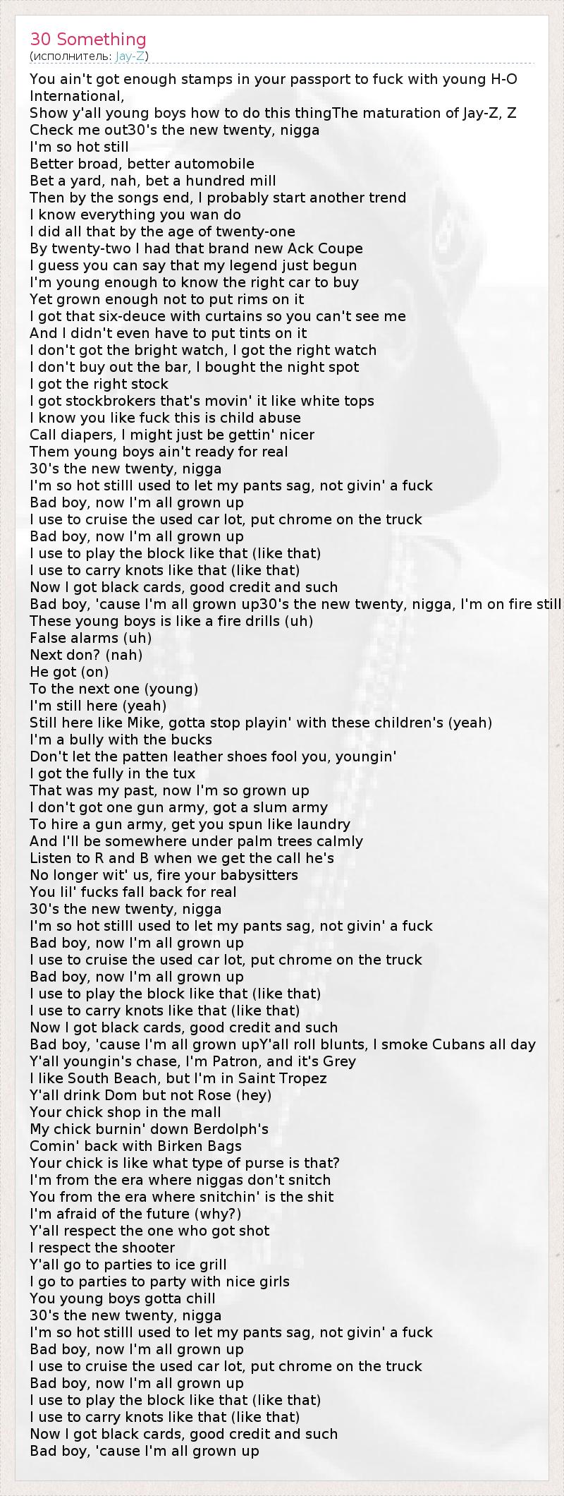 You ain't got enough stamps in your passport to fuck with young H-O International, Show y'all young boys how to do this thingThe maturation of Jay-Z, Z Check me out30's the new twenty, nigga I'm so hot still Better broad, better automobile Bet a yard, nah, bet a hundred mill Then by the songs end, I probably start another trend I know everything you wan do I did all that by the age of twenty-one By twenty-two I had that brand new Ack Coupe I guess you can say that my legend just begun I'm young enough to know the right car to buy Yet grown enough not to put rims on it I got that six-deuce with curtains so you can't see me And I didn't even have to put tints on it I don't got the bright watch, I got the right watch I don't buy out the bar, I bought the night spot I got the right stock I got stockbrokers that's movin' it like white tops I know you like fuck this is child abuse Call diapers, I might just be gettin' nicer Them young boys ain't ready for real 30's the new twenty, nigga I'm so hot stillI used to let my pants sag, not givin' a fuck Bad boy, now I'm all grown up I use to cruise the used car lot, put chrome on the truck Bad boy, now I'm all grown up I use to play the block like that (like that) I use to carry knots like that (like that) Now I got black cards, good credit and such Bad boy, 'cause I'm all grown up30's the new twenty, nigga, I'm on fire still These young boys is like a fire drills (uh) False alarms (uh) Next don? (nah) He got (on) To the next one (young) I'm still here (yeah) Still here like Mike, gotta stop playin' with these children's (yeah) I'm a bully with the bucks Don't let the patten leather shoes fool you, youngin' I got the fully in the tux That was my past, now I'm so grown up I don't got one gun army, got a slum army To hire a gun army, get you spun like laundry And I'll be somewhere under palm trees calmly Listen to R and B when we get the call he's No longer wit' us, fire your babysitters You lil' fucks fall back for real 30's the new twenty, nigga I'm so hot stillI used to let my pants sag, not givin' a fuck Bad boy, now I'm all grown up I use to cruise the used car lot, put chrome on the truck Bad boy, now I'm all grown up I use to play the block like that (like that) I use to carry knots like that (like that) Now I got black cards, good credit and such Bad boy, 'cause I'm all grown upY'all roll blunts, I smoke Cubans all day Y'all youngin's chase, I'm Patron, and it's Grey I like South Beach, but I'm in Saint Tropez Y'all drink Dom but not Rose (hey) Your chick shop in the mall My chick burnin' down Berdolph's Comin' back with Birken Bags Your chick is like what type of purse is that? I'm from the era where niggas don't snitch You from the era where snitchin' is the shit I'm afraid of the future (why?) Y'all respect the one who got shot I respect the shooter Y'all go to parties to ice grill I go to parties to party with nice girls You young boys gotta chill 30's the new twenty, nigga I'm so hot stillI used to let my pants sag, not givin' a fuck Bad boy, now I'm all grown up I use to cruise the used car lot, put chrome on the truck Bad boy, now I'm all grown up I use to play the block like that (like that) I use to carry knots like that (like that) Now I got black cards, good credit and such Bad boy, 'cause I'm all grown up
