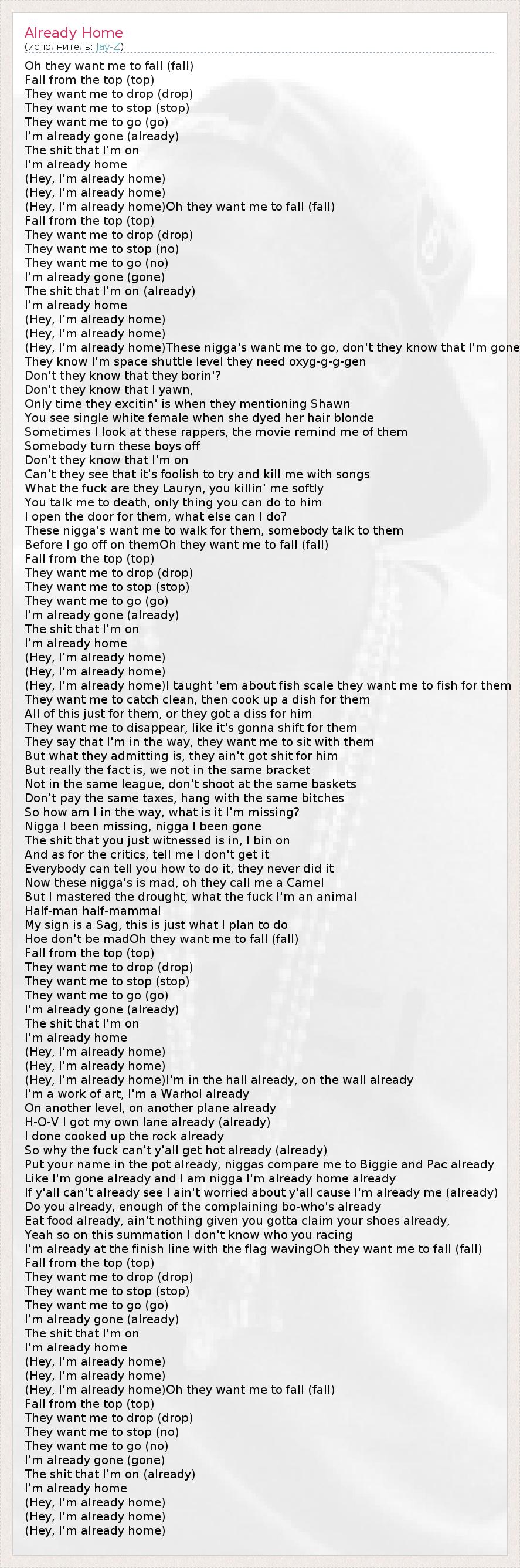 Like I'm gone already and I am nigga I'm already home already