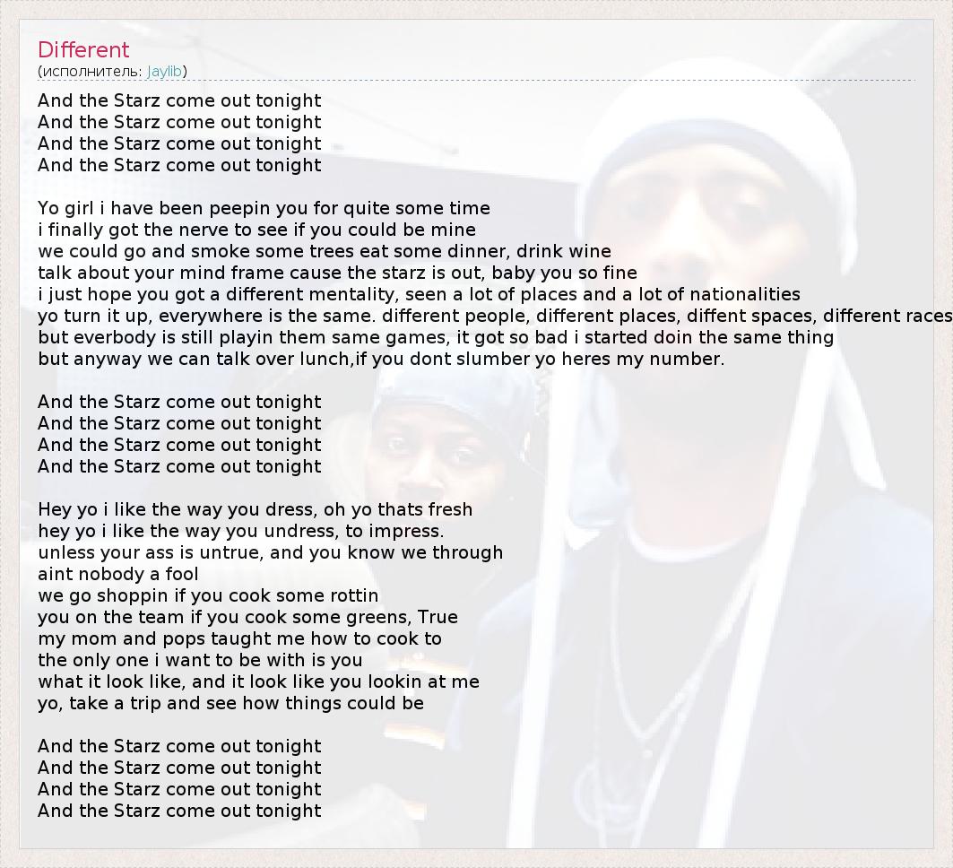 And the Starz come out tonight And the Starz come out tonight And the Starz come out tonight And the Starz come out tonight Yo girl i have been peepin you for quite some time i finally got the nerve to see if you could be mine we could go and smoke some trees eat some dinner, drink wine talk about your mind frame cause the starz is out, baby you so fine i just hope you got a different mentality, seen a lot of places and a lot of nationalities yo turn it up, everywhere is the same. different people, different places, diffent spaces, different races but everbody is still playin them same games, it got so bad i started doin the same thing but anyway we can talk over lunch,if you dont slumber yo heres my number. And the Starz come out tonight And the Starz come out tonight And the Starz come out tonight And the Starz come out tonight Hey yo i like the way you dress, oh yo thats fresh hey yo i like the way you undress, to impress. unless your ass is untrue, and you know we through aint nobody a fool we go shoppin if you cook some rottin you on the team if you cook some greens, True my mom and pops taught me how to cook to the only one i want to be with is you what it look like, and it look like you lookin at me yo, take a trip and see how things could be And the Starz come out tonight And the Starz come out tonight And the Starz come out tonight And the Starz come out tonight