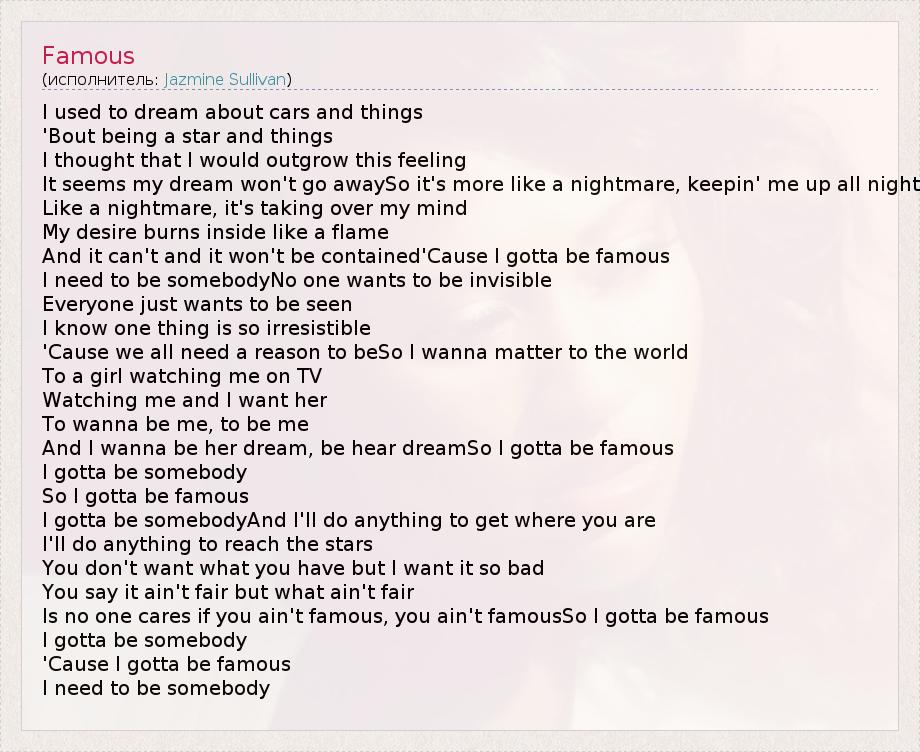 Is no one cares if you ain't famous, you ain't famousSo I gotta be famous