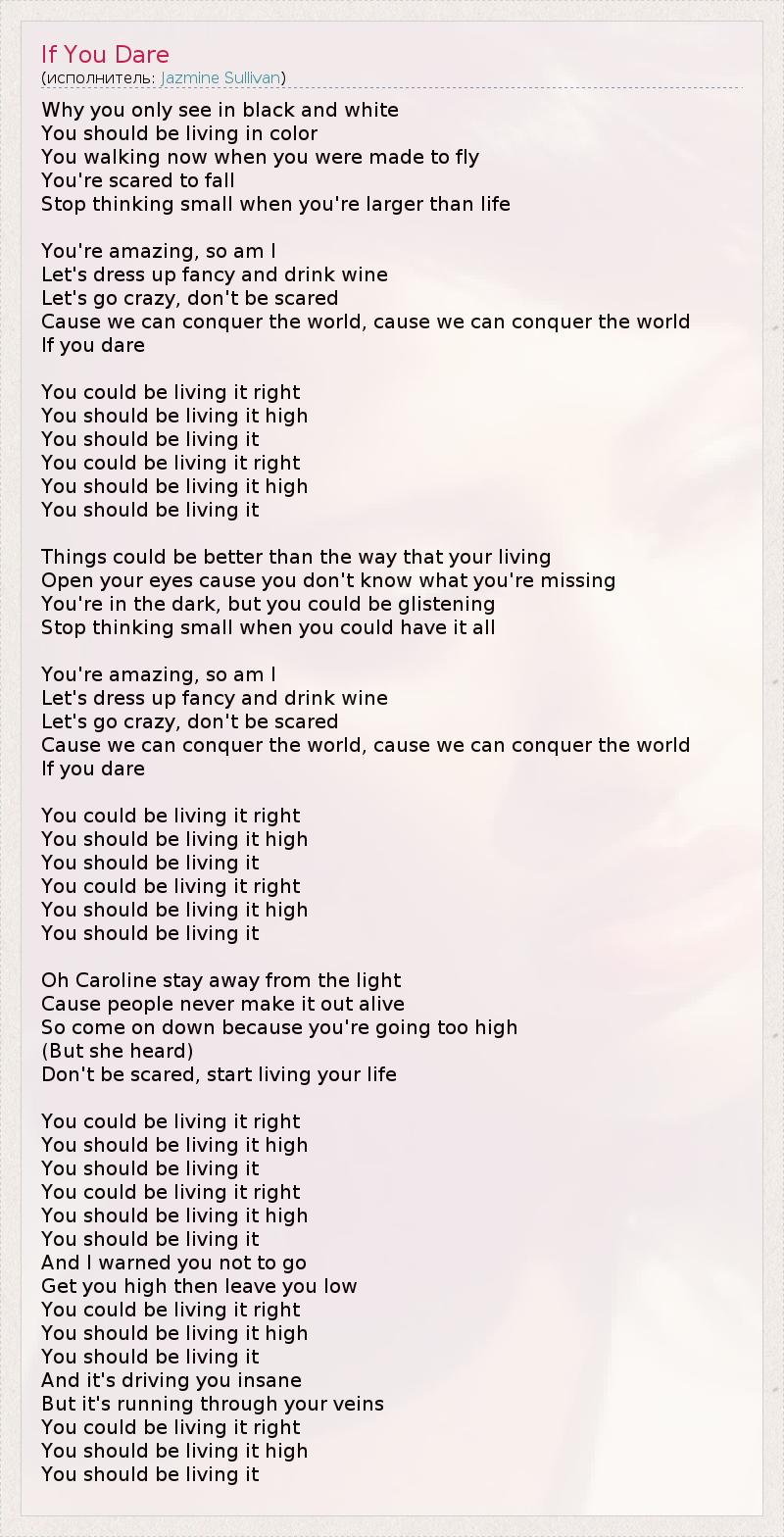 Why you only see in black and white You should be living in color You walking now when you were made to fly You're scared to fall Stop thinking small when you're larger than life You're amazing, so am I Let's dress up fancy and drink wine Let's go crazy, don't be scared Cause we can conquer the world, cause we can conquer the world If you dare You could be living it right You should be living it high You should be living it You could be living it right You should be living it high You should be living it Things could be better than the way that your living Open your eyes cause you don't know what you're missing You're in the dark, but you could be glistening Stop thinking small when you could have it all You're amazing, so am I Let's dress up fancy and drink wine Let's go crazy, don't be scared Cause we can conquer the world, cause we can conquer the world If you dare You could be living it right You should be living it high You should be living it You could be living it right You should be living it high You should be living it Oh Caroline stay away from the light Cause people never make it out alive So come on down because you're going too high (But she heard) Don't be scared, start living your life You could be living it right You should be living it high You should be living it You could be living it right You should be living it high You should be living it And I warned you not to go Get you high then leave you low You could be living it right You should be living it high You should be living it And it's driving you insane But it's running through your veins You could be living it right You should be living it high You should be living it