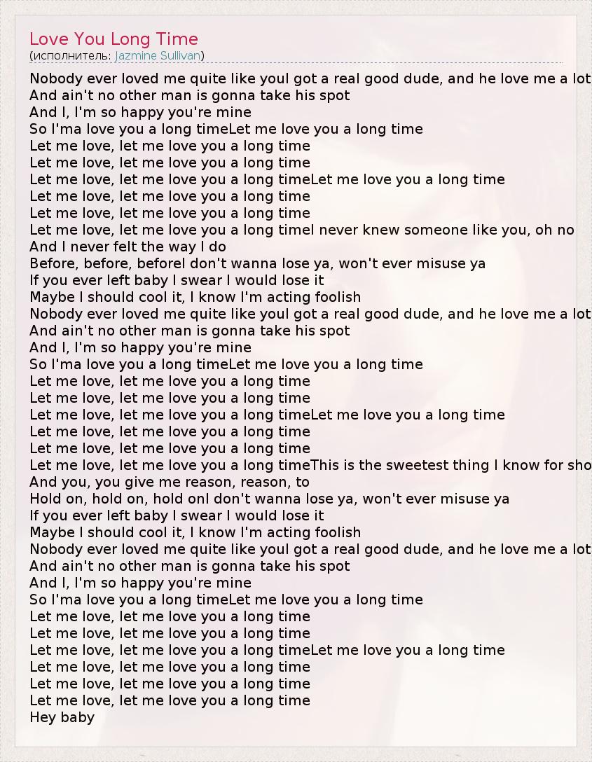 Nobody ever loved me quite like youI got a real good dude, and he love me a lot And ain't no other man is gonna take his spot And I, I'm so happy you're mine So I'ma love you a long timeLet me love you a long time Let me love, let me love you a long time Let me love, let me love you a long time Let me love, let me love you a long timeLet me love you a long time Let me love, let me love you a long time Let me love, let me love you a long time Let me love, let me love you a long timeI never knew someone like you, oh no And I never felt the way I do Before, before, beforeI don't wanna lose ya, won't ever misuse ya If you ever left baby I swear I would lose it Maybe I should cool it, I know I'm acting foolish Nobody ever loved me quite like youI got a real good dude, and he love me a lot And ain't no other man is gonna take his spot And I, I'm so happy you're mine So I'ma love you a long timeLet me love you a long time Let me love, let me love you a long time Let me love, let me love you a long time Let me love, let me love you a long timeLet me love you a long time Let me love, let me love you a long time Let me love, let me love you a long time Let me love, let me love you a long timeThis is the sweetest thing I know for sho And you, you give me reason, reason, to Hold on, hold on, hold onI don't wanna lose ya, won't ever misuse ya If you ever left baby I swear I would lose it Maybe I should cool it, I know I'm acting foolish Nobody ever loved me quite like youI got a real good dude, and he love me a lot And ain't no other man is gonna take his spot And I, I'm so happy you're mine So I'ma love you a long timeLet me love you a long time Let me love, let me love you a long time Let me love, let me love you a long time Let me love, let me love you a long timeLet me love you a long time Let me love, let me love you a long time Let me love, let me love you a long time Let me love, let me love you a long time Hey baby